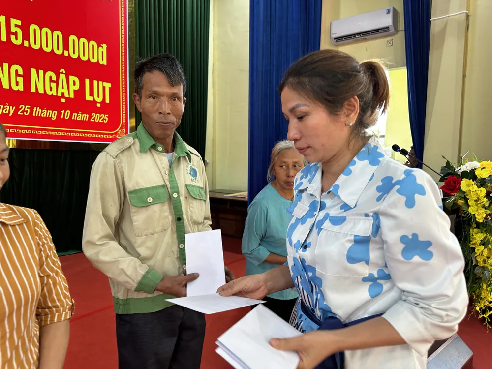 Các thành viên nhóm thiện nguyện trao quà cho các hộ dân bị bị ngập lụt do bão số 11.