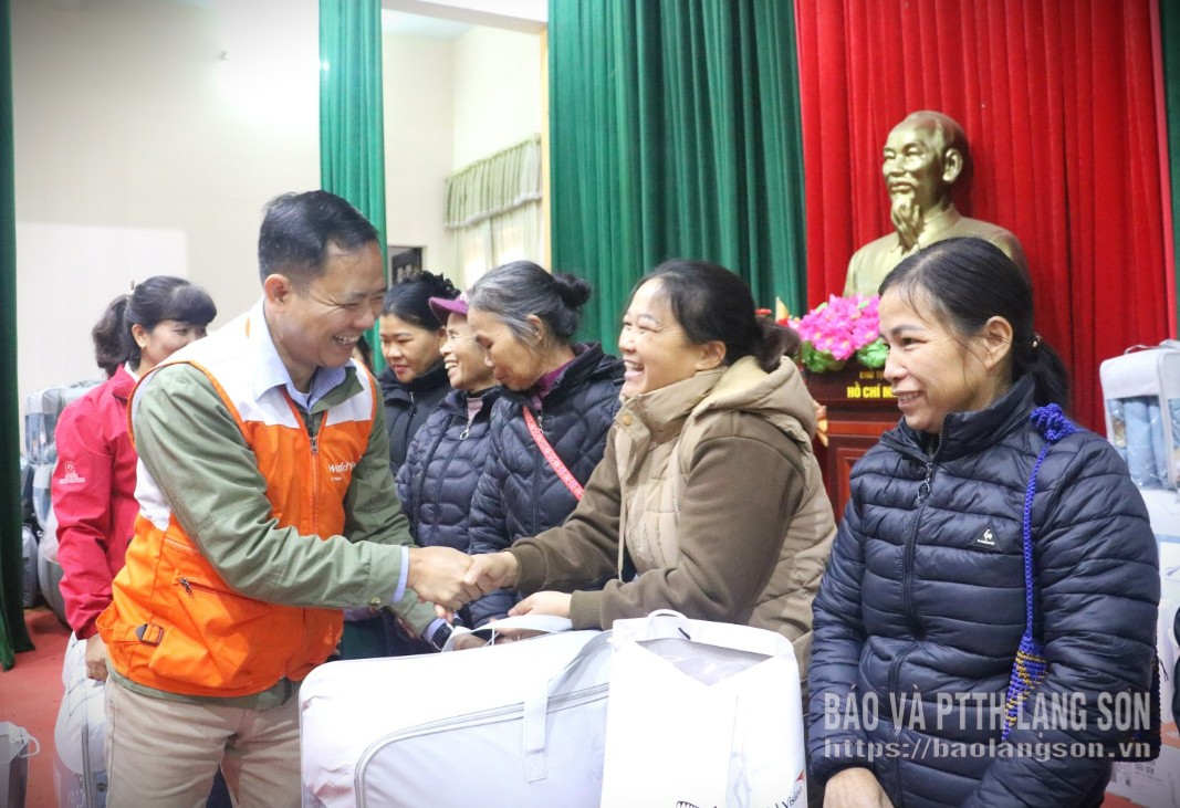 Đại diện tổ chức World Vision International tại Việt Nam trao quà cho các hộ dân bị ảnh hưởng bởi mưa bão tại xã Thất Khê