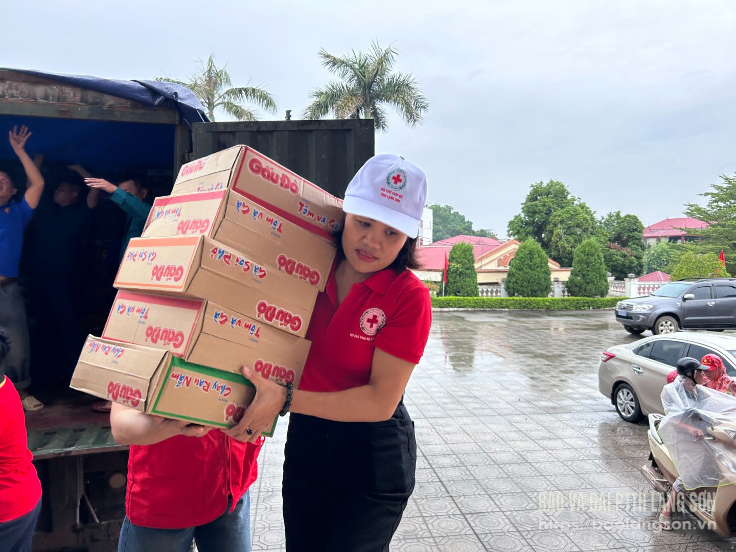 Lãnh đạo Hội Chữ thập đỏ tỉnh hỗ trợ vận chuyển quà cho các hộ dân bị ảnh hưởng bởi cơn bão số 11 tại xã Hữu Lũng