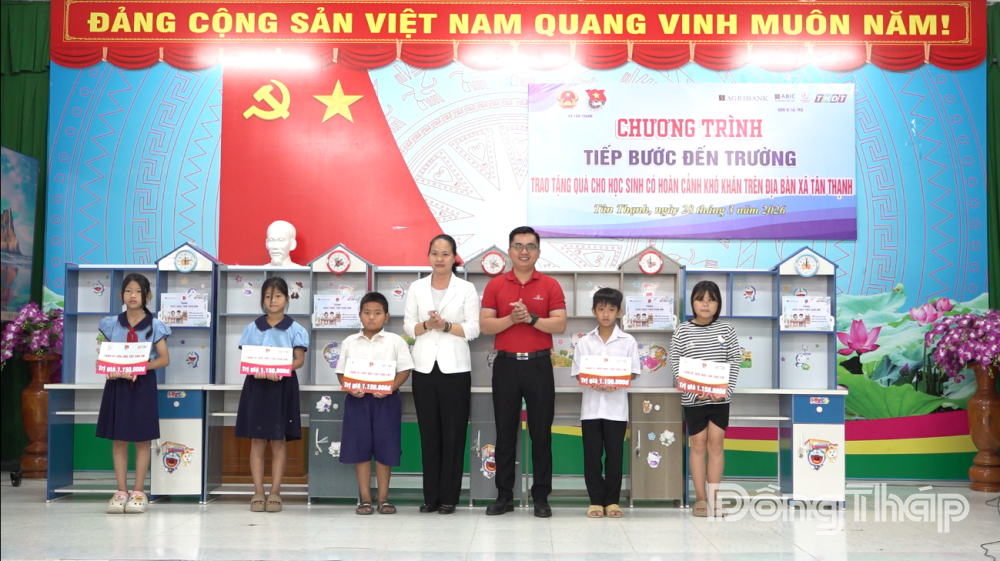 Tại đây, Ban Tổ chức trao 10 suất học bổng (mỗi suất 200.000 đồng tiền mặt) và 10 “góc học tập” (mỗi góc trị giá 1,15 triệu đồng) cho 20 em học sinh khó khăn đang học tại các Trường: Tiểu học Tân Thạnh 1, Tiểu học Phú Lợi 1, Tiểu học Phú Lợi 2, THCS Tân Thạnh và THCS Phú Lợi.