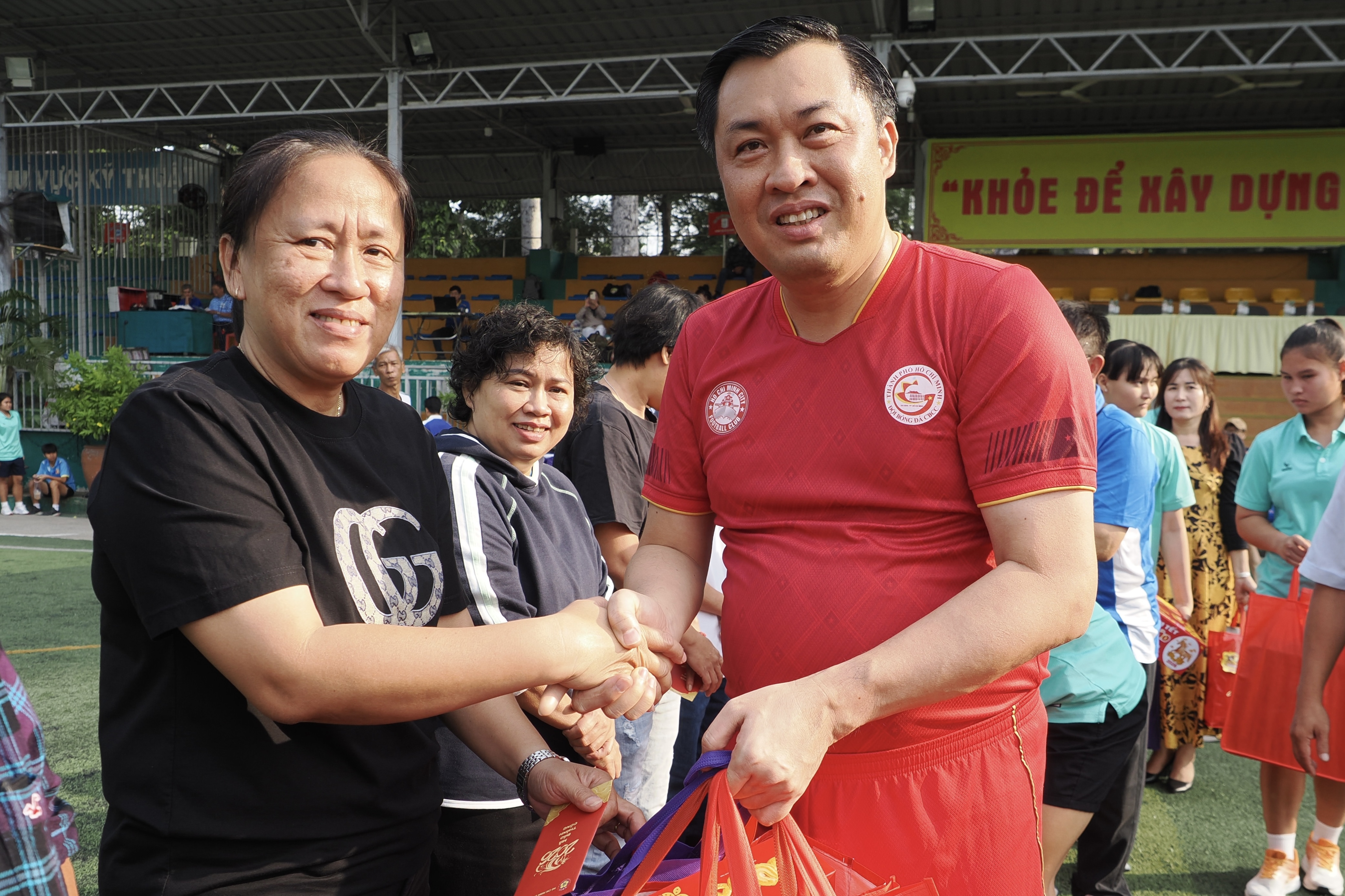 Phó Giám đốc Sở VH-TT TPHCM Cao Văn Chóng trao quà đến cựu tuyển thủ bóng đá nữ TPHCM tại chương trình giao hữu và tri ân nhân dịp Xuân Bính Ngọ 2026. Ảnh: HOÀNG HÙNG