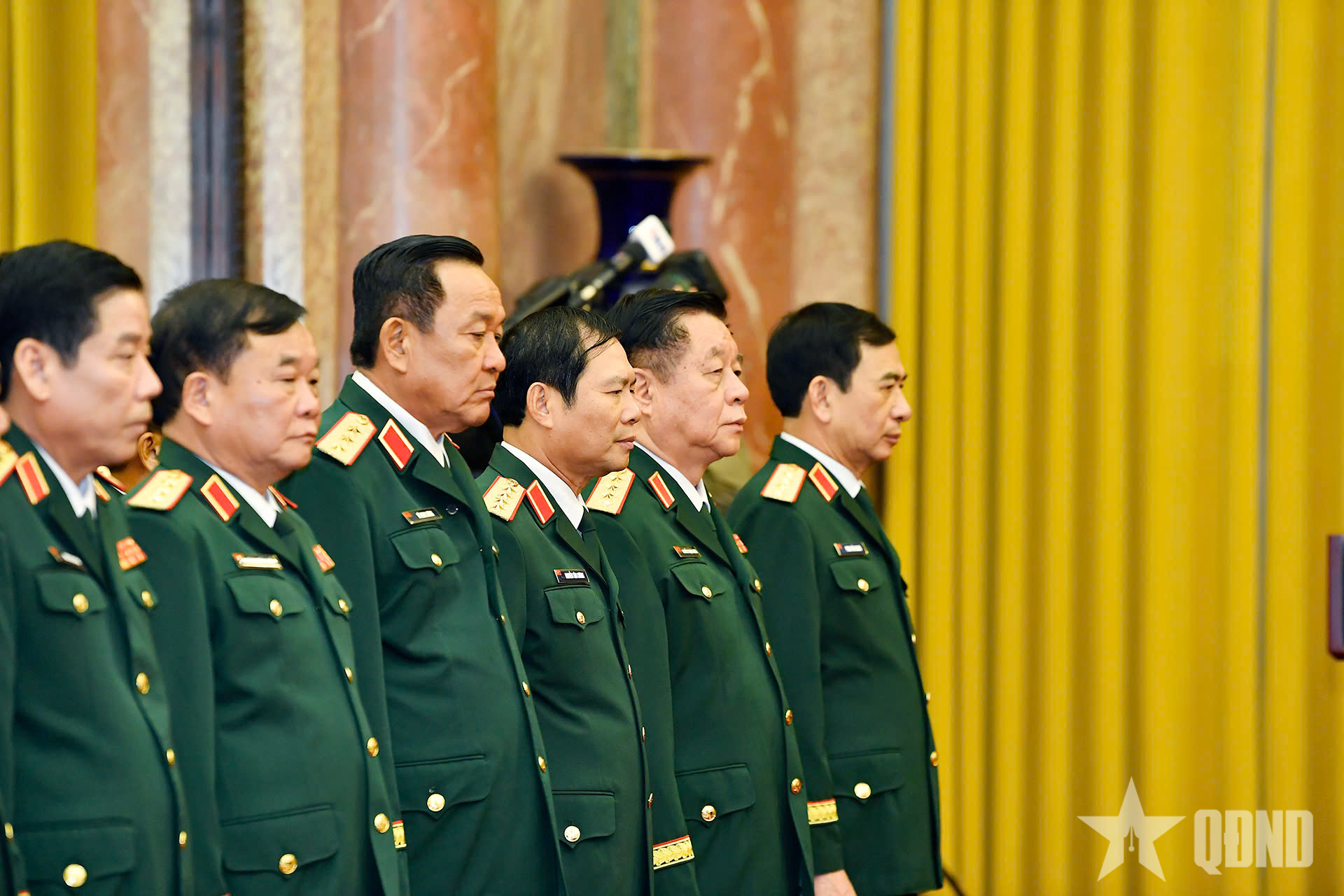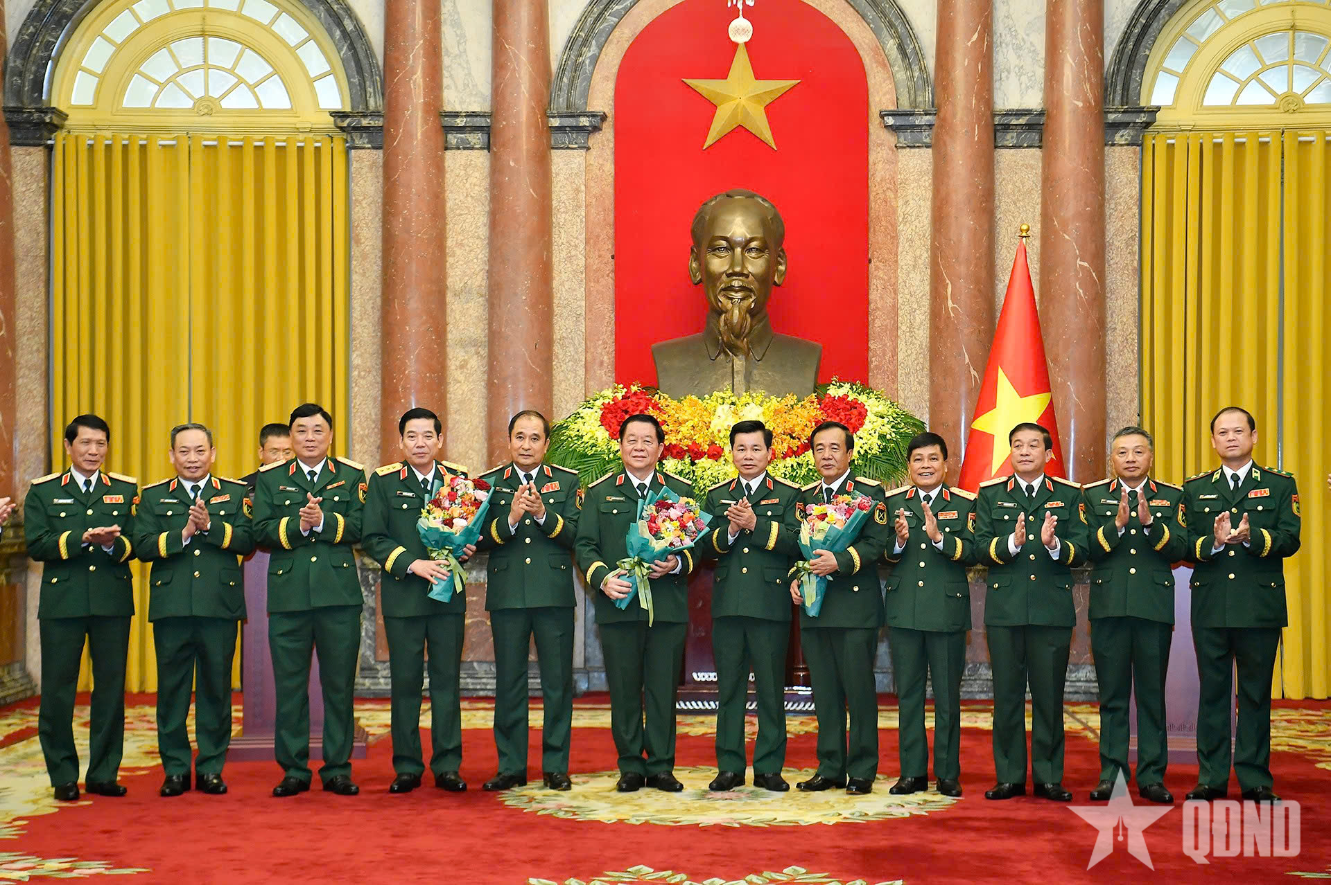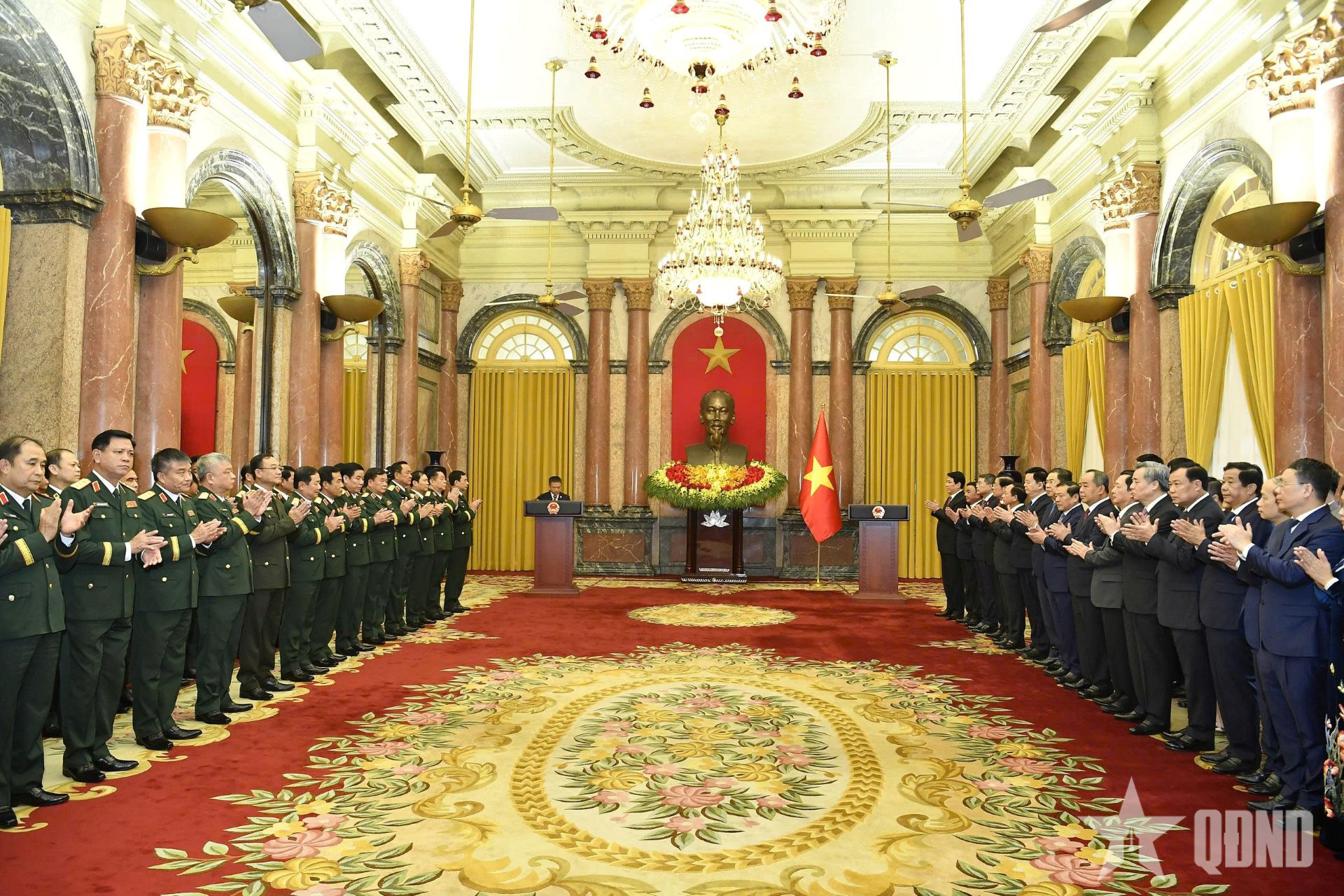 Đánh giá tình hình đó đang đặt ra những yêu cầu mới ngày càng cao đối với Lực lượng vũ trang trong nhiệm vụ xây dựng và bảo vệ Tổ quốc, Chủ tịch nước đề nghị các đồng chí vừa được bổ nhiệm, thăng quân hàm tiếp tục phát huy truyền thống vẻ vang của Quân đội nhân dân Việt Nam anh hùng và phẩm chất Bộ đội Cụ Hồ; tiếp tục giữ gìn đạo đức cách mạng, tuyệt đối trung thành với Đảng, Tổ quốc và nhân dân; đoàn kết, gắn bó máu thịt với cán bộ, chiến sĩ và nhân dân; tiếp tục học tập, tu dưỡng, rèn luyện để luôn xứng đáng là người lãnh đạo, chỉ huy tài năng, mẫu mực, nỗ lực phấn đấu, khắc phục khó khăn, thử thách, hoàn thành xuất sắc mọi nhiệm vụ mà Đảng, Nhà nước và nhân dân tin tưởng giao phó.