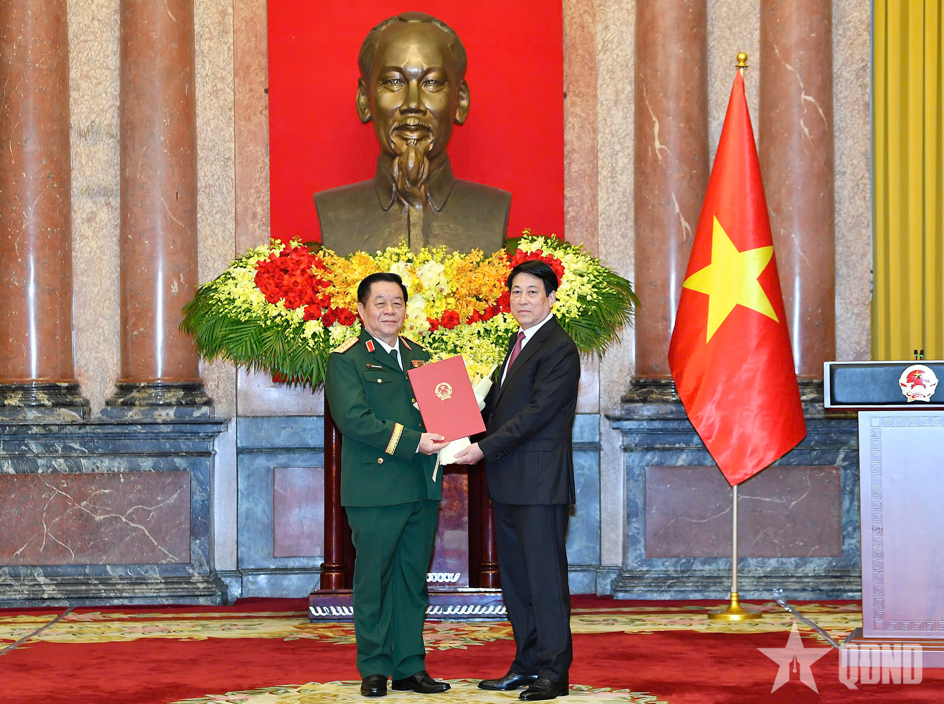 Chủ tịch nước Lương Cường, Ủy viên Bộ Chính trị, Thống lĩnh lực lượng vũ trang nhân dân, Chủ tịch Hội đồng Quốc phòng và An ninh trao Quyết định bổ nhiệm chức vụ Chủ nhiệm Tổng cục Chính trị Quân đội nhân dân Việt Nam và trao Quyết định thăng quân hàm cấp Đại tướng đối với đồng chí Nguyễn Trọng Nghĩa.