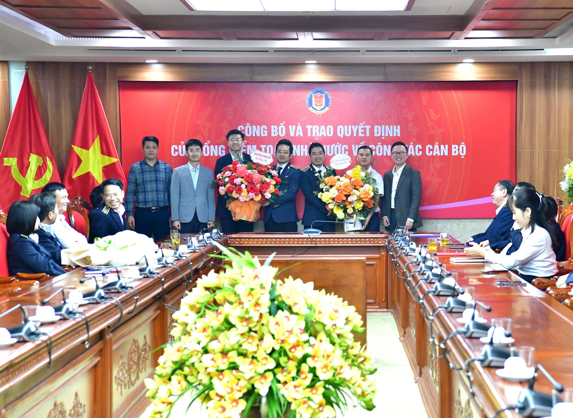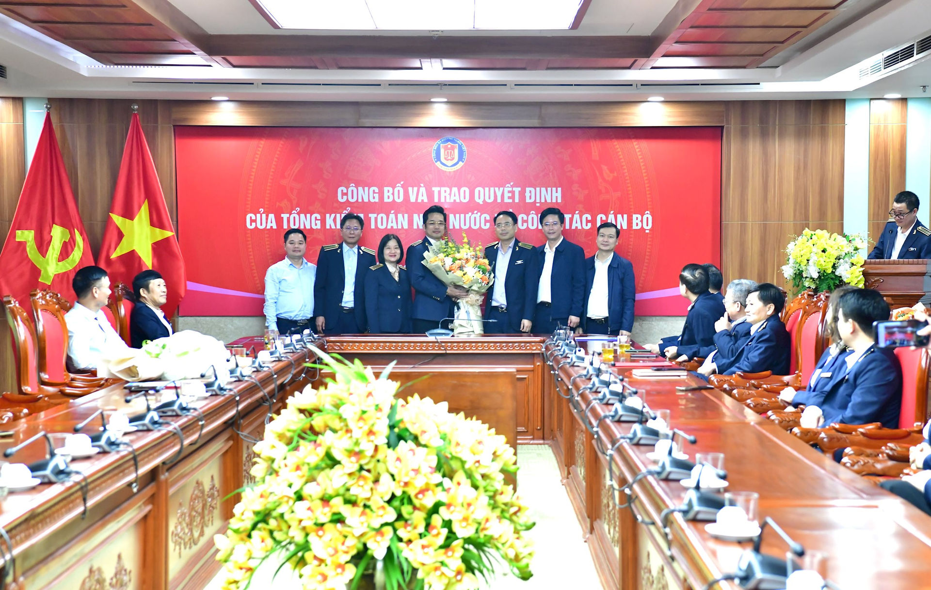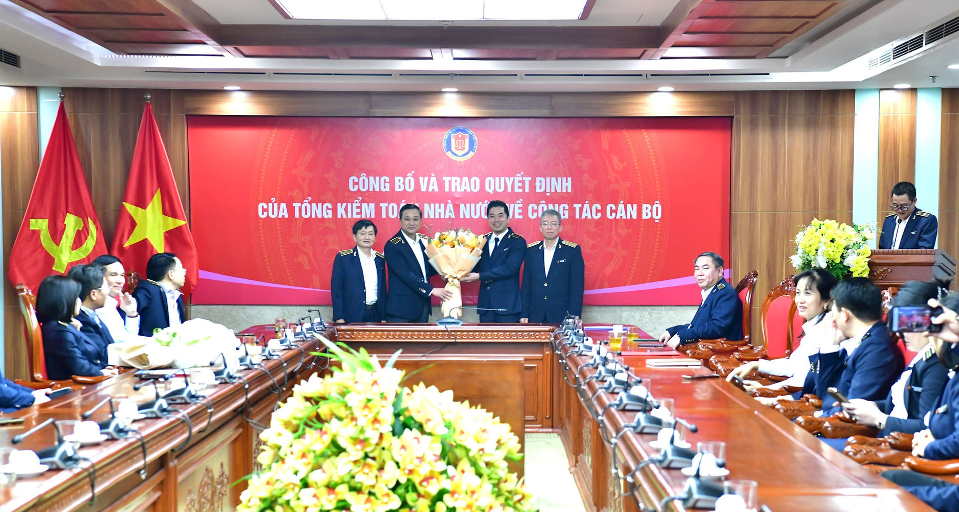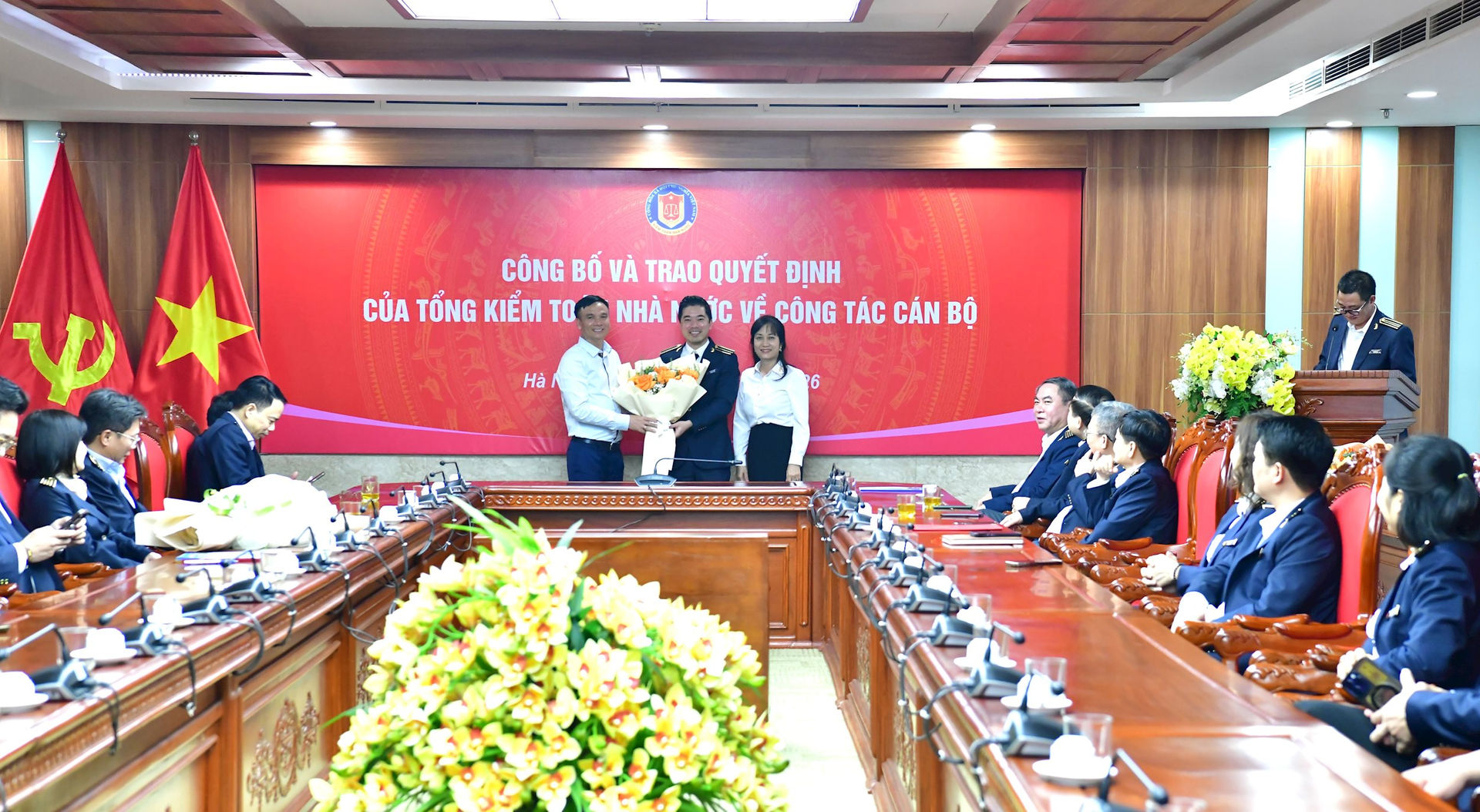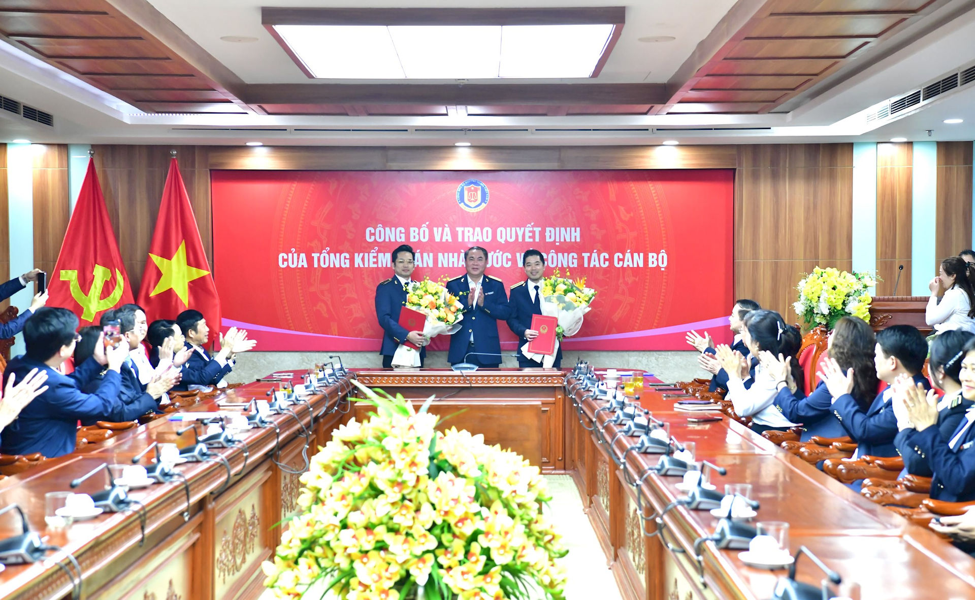 Thay mặt lãnh đạo KTNN, Phó Tổng Kiểm toán nhà nước Trần Minh Khương đã trao các Quyết định bổ nhiệm và tặng hoa chúc mừng đồng chí Nguyễn Huy Hoài và đồng chí Lê Mạnh Cường.