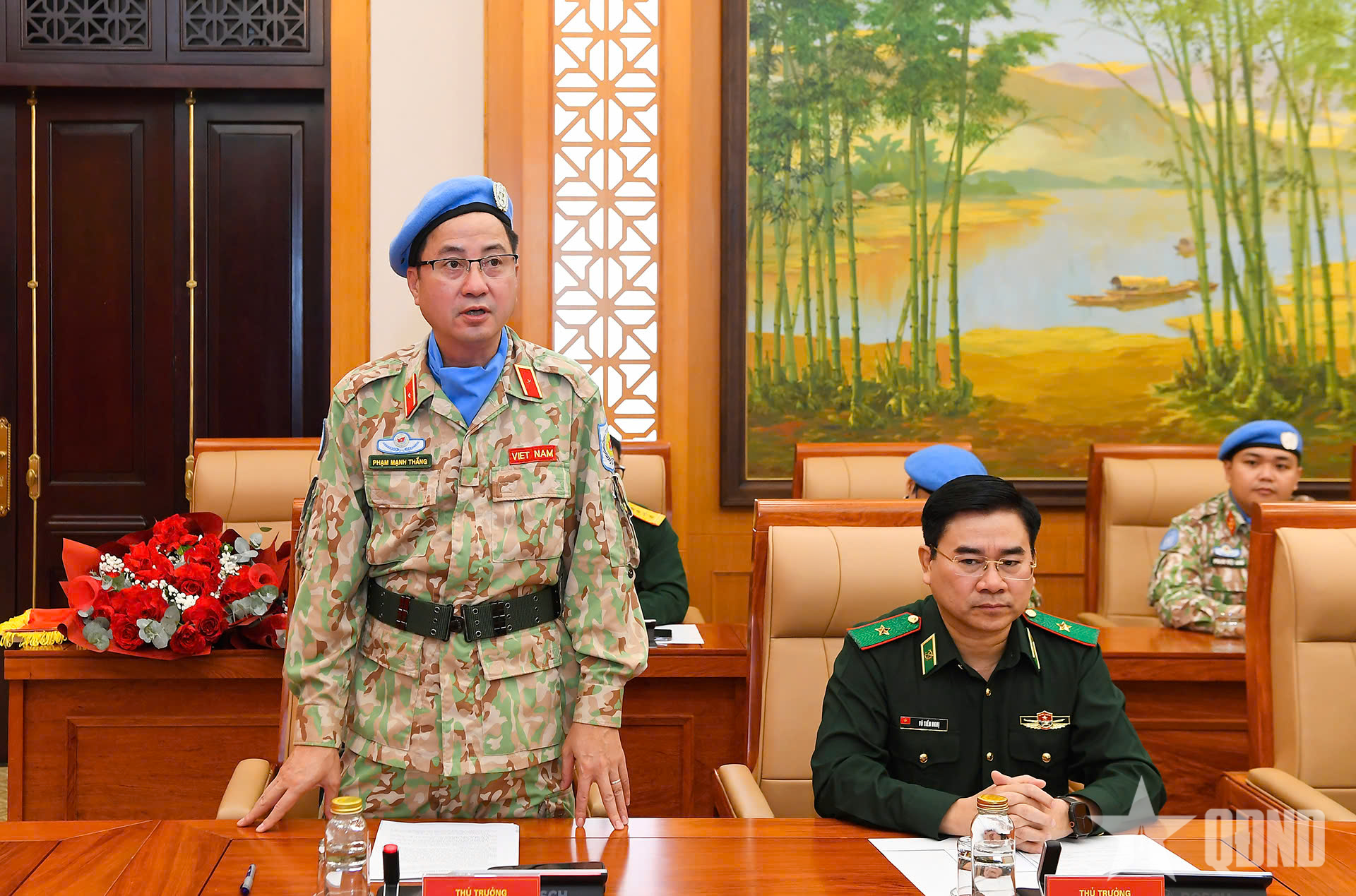 Đại diện các sĩ quan nhận nhiệm vụ, Trung tá Nguyễn Ngọc Linh phát biểu bày tỏ vinh dự, tự hào khi được Đảng, Nhà nước, Quân đội tin tưởng giao nhiệm vụ; đồng thời khẳng định quyết tâm hoàn thành xuất sắc nhiệm vụ, góp phần lan tỏa hình ảnh đất nước, con người Việt Nam yêu chuộng hòa bình.