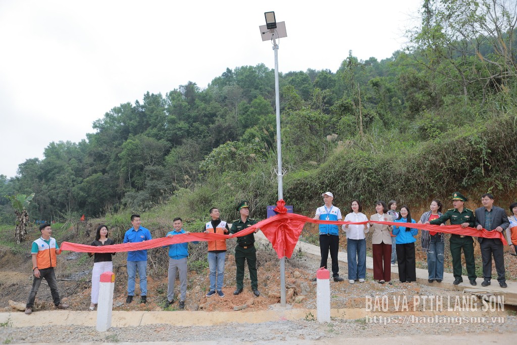Các đại biểu kéo băng khánh thành "Công trình thanh niên thắp sáng đường biên"