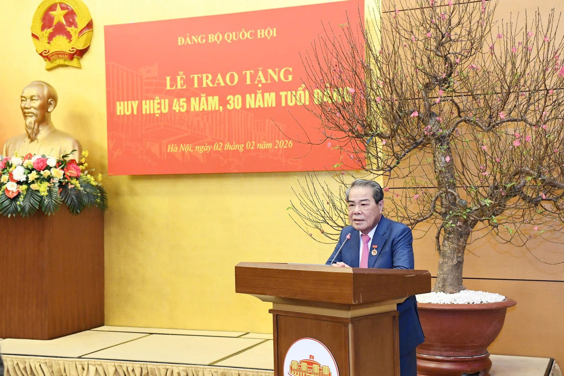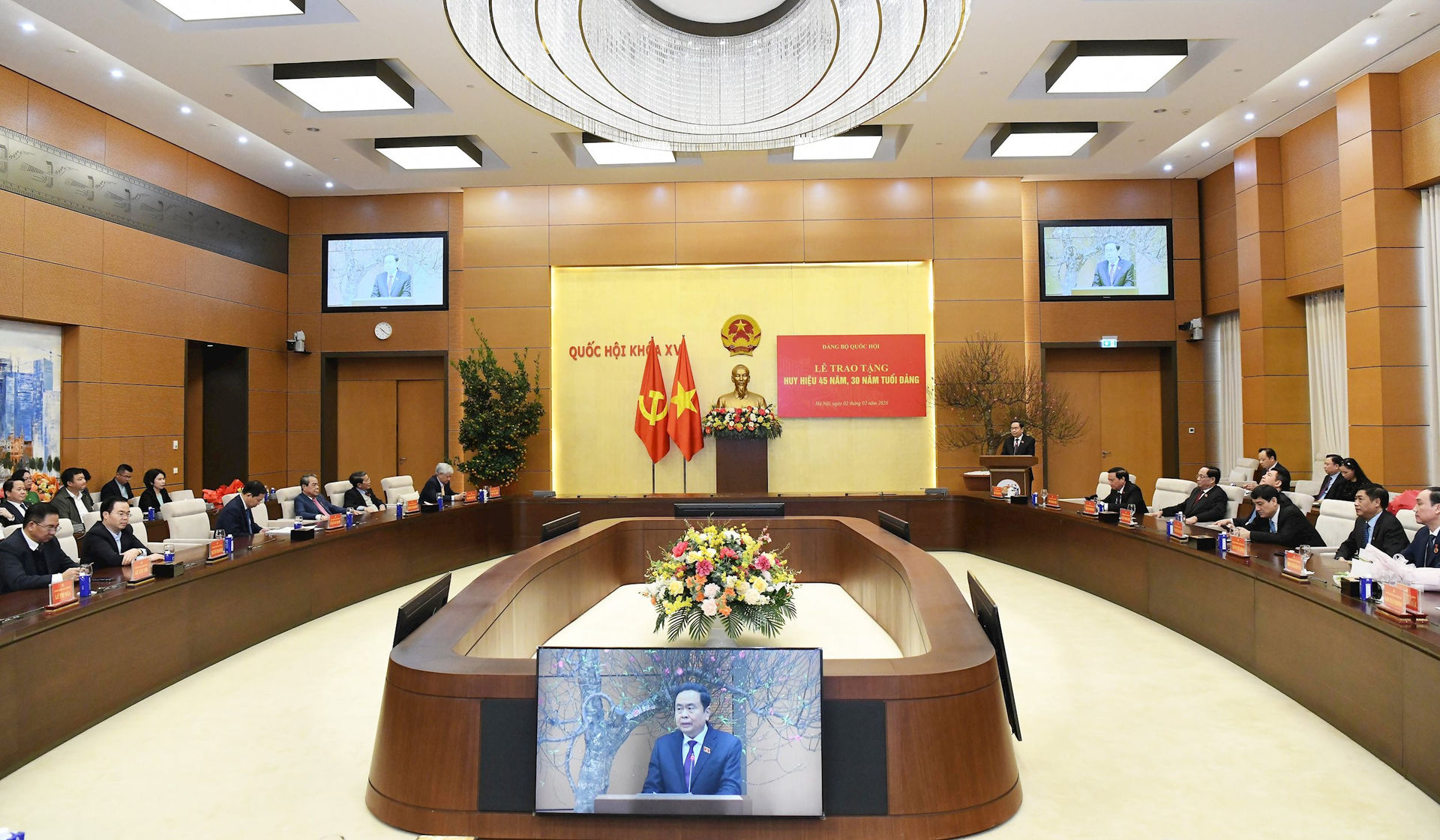 Tại buổi Lễ, Bí thư Đảng ủy Quốc hội, Chủ tịch Quốc hội Trần Thanh Mẫn chúc mừng 2 đồng chí được trao tặng Huy hiệu Đảng đúng dịp kỷ niệm 96 năm thành lập Đảng và Đại hội đại biểu toàn quốc lần thứ XIV của Đảng vừa thành công hết sức tốt đẹp.