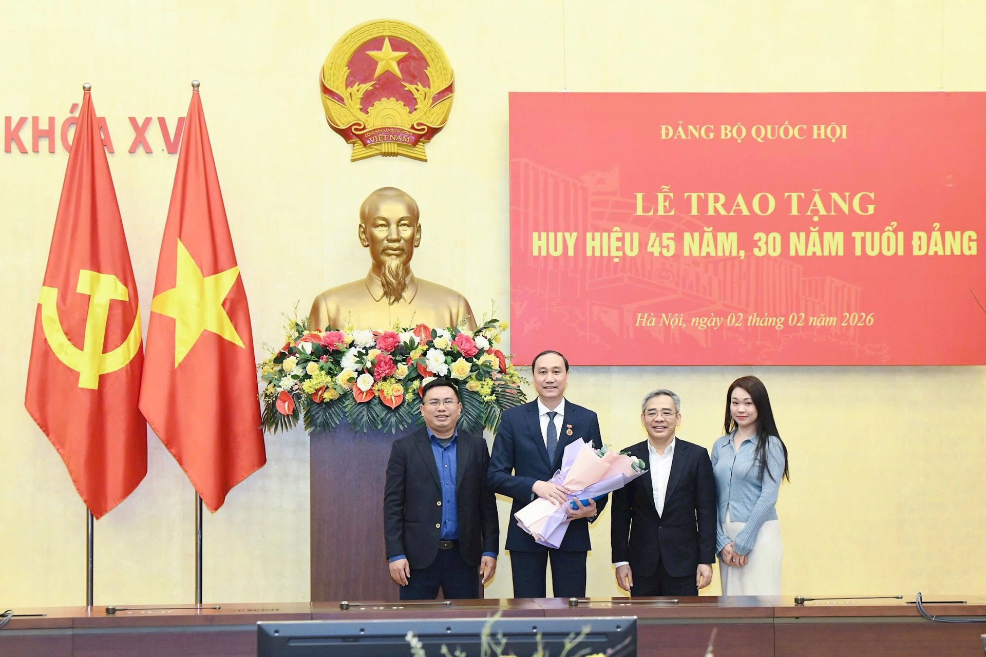 Tại buổi Lễ, Bí thư Đảng ủy Quốc hội, Chủ tịch Quốc hội Trần Thanh Mẫn đã trao Huy hiệu 45 năm tuổi Đảng và tặng hoa chúc mừng đồng chí Dương Thanh Bình - nguyên Ủy viên BCH Trung ương Đảng, Ủy viên Ban Thường vụ Đảng ủy Quốc hội, Ủy viên Ủy ban Thường vụ Quốc hội, Chủ nhiệm Ủy ban Dân nguyện và Giám sát. Phó Bí thư Thường trực Đảng ủy Quốc hội, Phó Chủ tịch Thường trực Đảng ủy Quốc hội Đỗ Văn Chiến đã trao Huy hiệu 30 năm tuổi Đảng và tặng hoa chúc mừng Phó Bí thư Đảng ủy Quốc hội Phùng Khánh Tài.