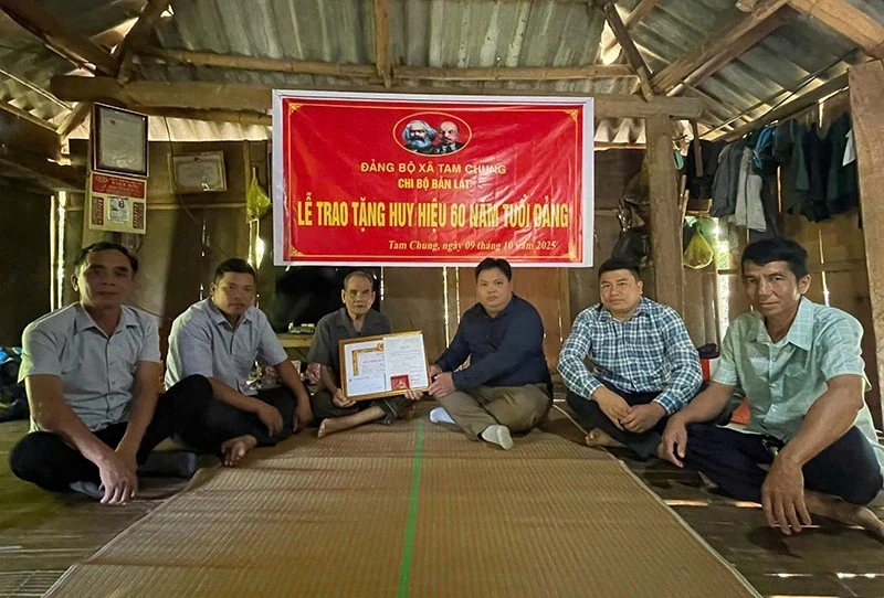 Đại diện lãnh đạo Đảng ủy xã Tam Chung trao Huy hiệu 60 năm tuổi Đảng cho đảng viên lão thành Hà Văn Sổ.