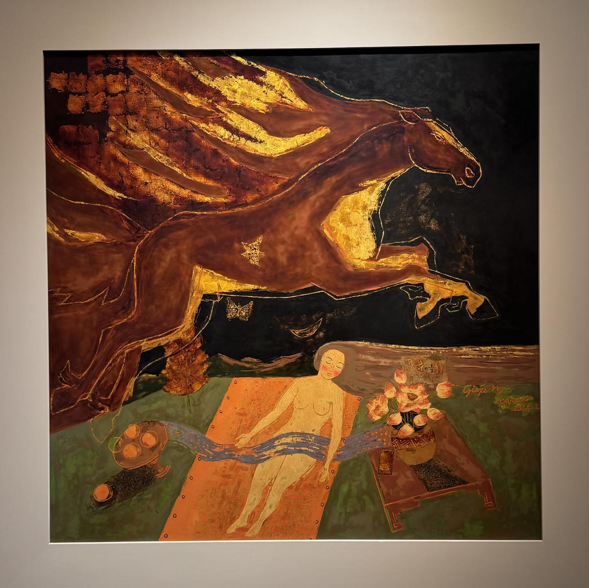 Tại buổi lễ, họa sĩ Nguyễn Trà Vinh chia sẻ, trong quá trình chuẩn bị triển lãm kỷ niệm 30 năm sáng tác sơn mài, anh chợt nhớ đến bức tranh “Đợi chờ” – tác phẩm từng được in trên bìa cuốn sách “Ấn định ước mơ”. Ý nghĩ hiến tặng cho Bảo tàng Mỹ thuật Việt Nam đến một cách tự nhiên.