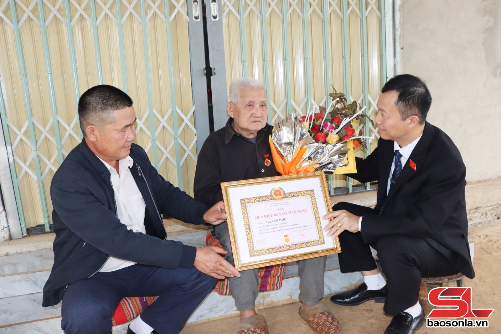 Lãnh đạo xã Chiềng Mung trao tặng Huy hiệu 60 năm tuổi Đảng cho đảng viên Hà Văn Hợp, Chi bộ bản Thống Nhất.