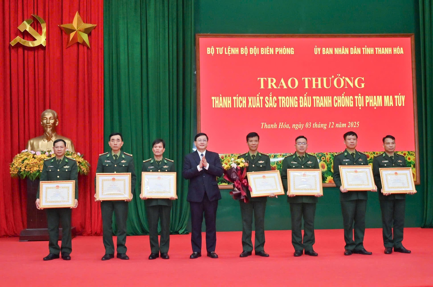 Ngày 3/12, Bộ Tư lệnh Bộ đội Biên phòng phối hợp với UBND tỉnh Thanh Hóa tổ chức trao thưởng thành tích xuất sắc trong đấu tranh chống tội phạm ma túy cho Bộ đội Biên phòng tỉnh.