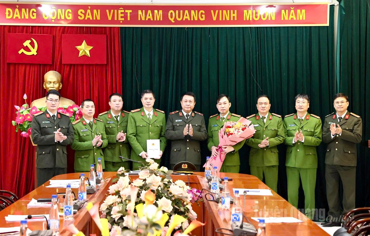 Thiếu tướng Nguyễn Đức Thuận, Giám đốc Công an tỉnh trao thưởng, tặng hoa chúc mừng Ban Chuyên án.