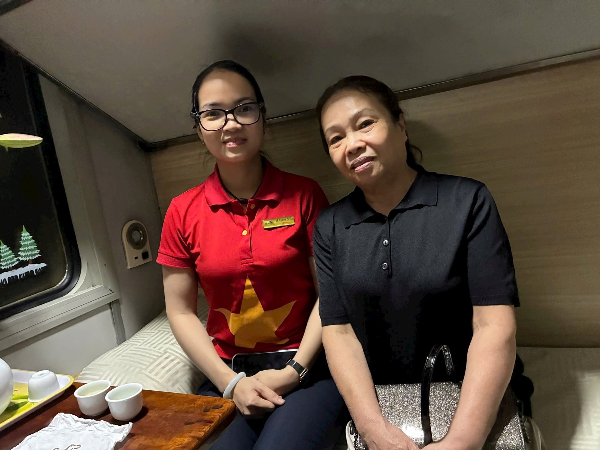 Tiếp viên Lê Thị Minh Quyên cùng hành khách bỏ quên đồ trang sức trên tàu. (Ảnh: VNR).