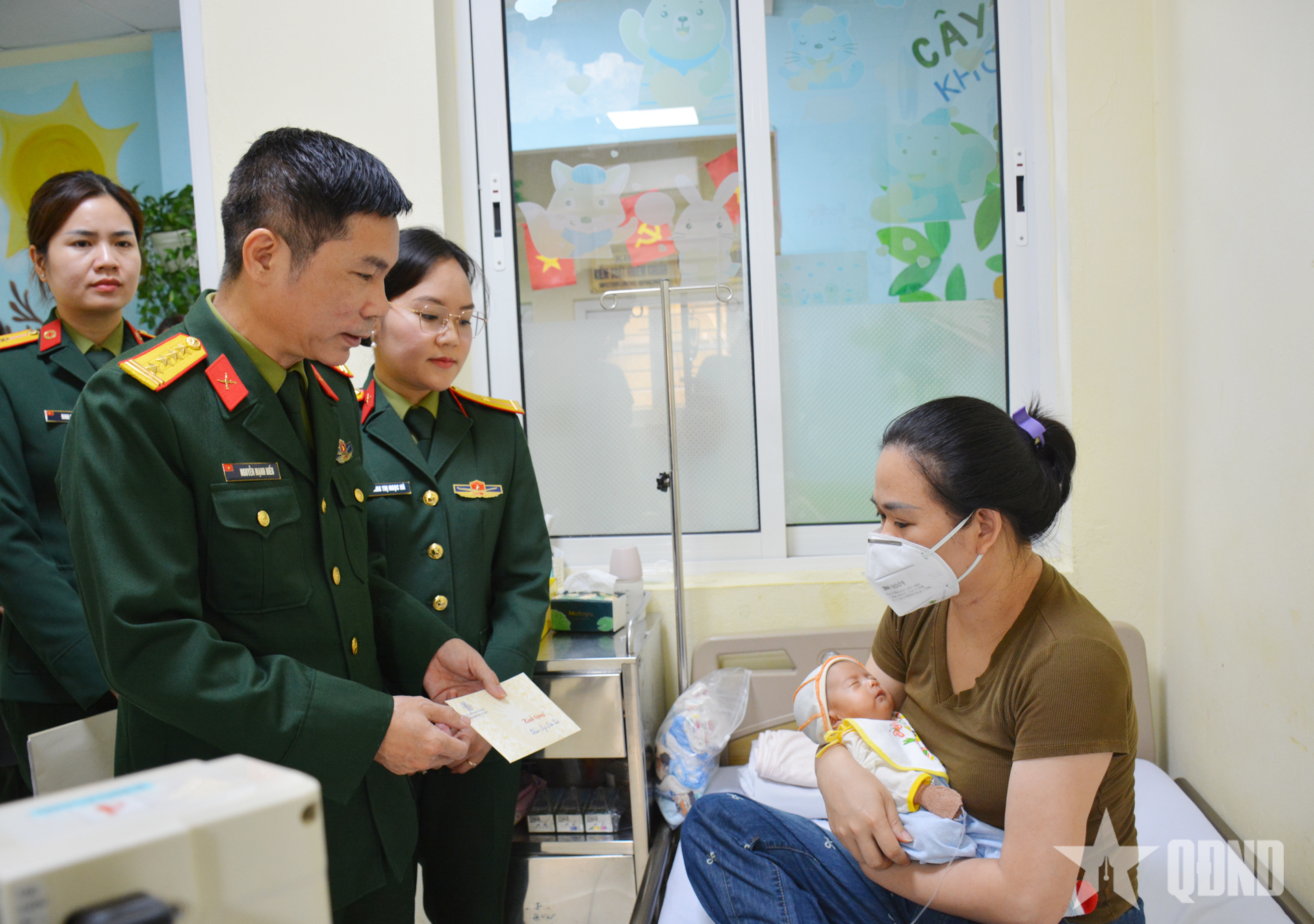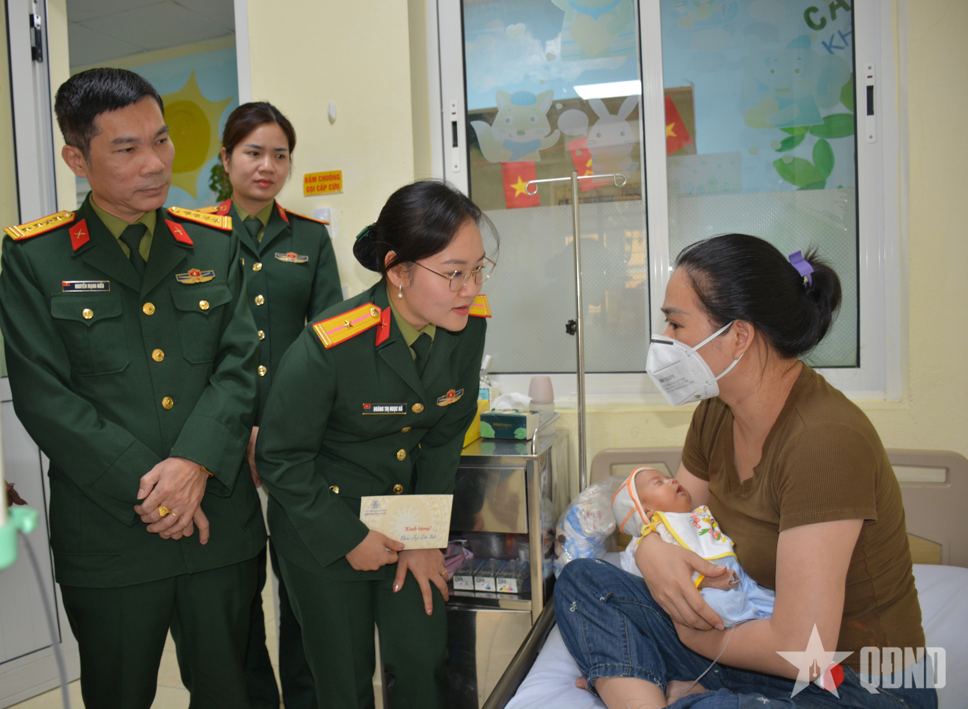 Thiếu tá QNCN Hoàng Thị Ngọc Hà, Chủ tịch Hội Phụ nữ cơ sở Cục Đối ngoại ân cần thăm hỏi bệnh nhi Ngô Diệu Linh (sinh ngày 5-1-2026) đang điều trị tại bệnh viện.