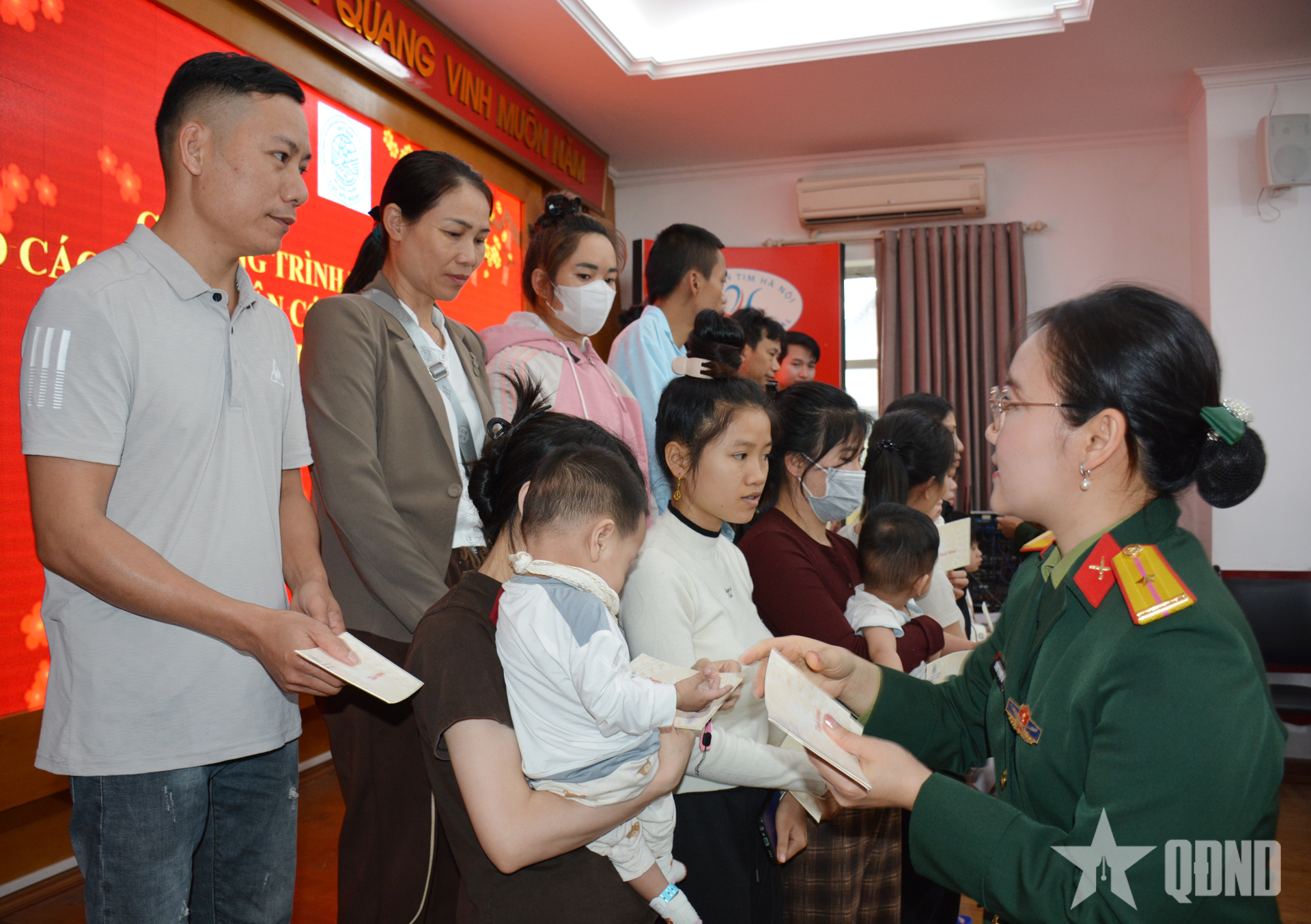 Đại tá Nguyễn Mạnh Hiếu, Chủ nhiệm Chính trị Cục Đối ngoại và đại diện Ban chấp hành Hội Phụ nữ cơ sở trao quà tặng bệnh nhi Ngô Diệu Linh.