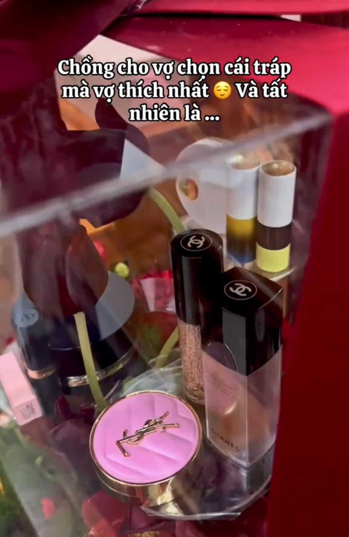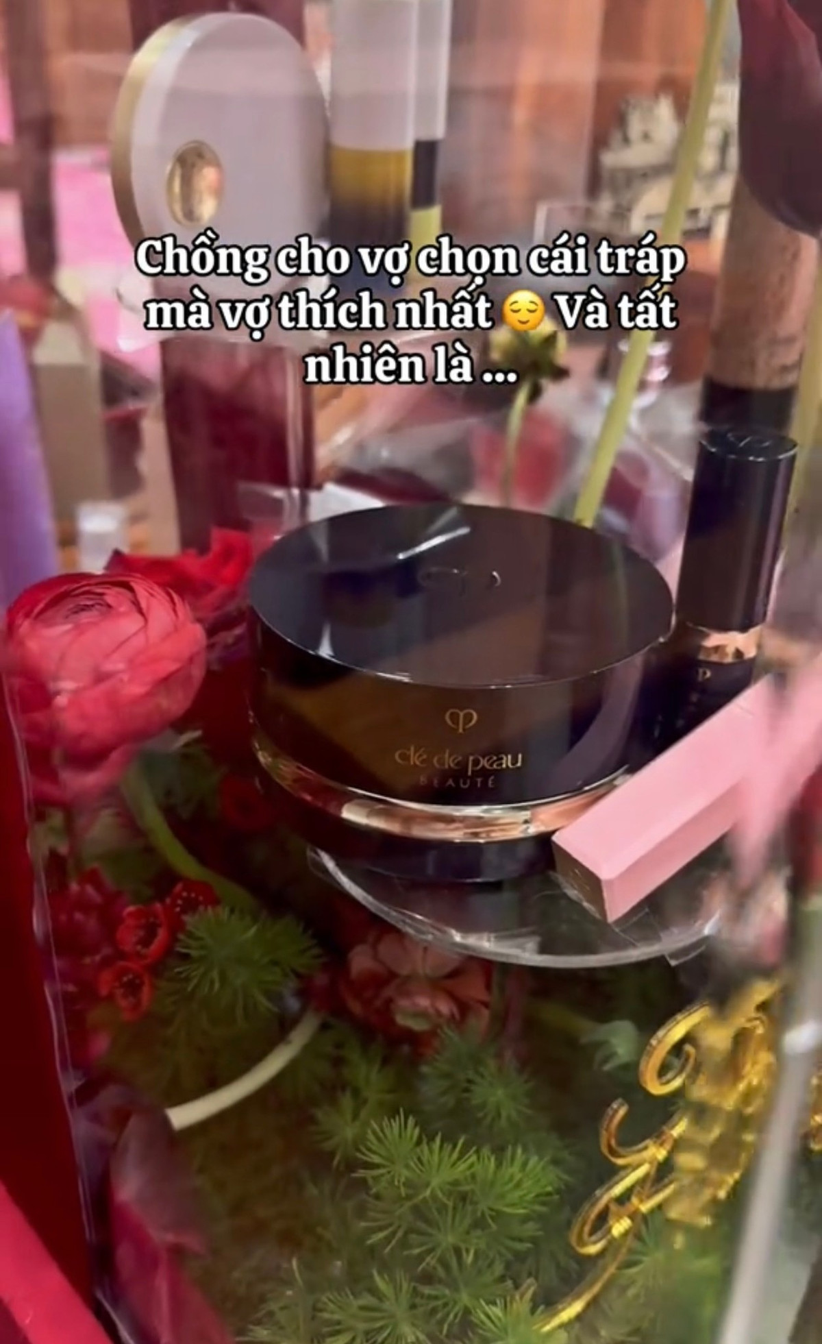 Thay vì các lễ vật truyền thống như trầu cau, bánh kẹo, tiền vàng, tráp sính lễ này lại là một hộp quà trong suốt được trang trí lộng lẫy, bên trong là những món đồ trang điểm đắt tiền mà mọi cô gái đều mơ ước.