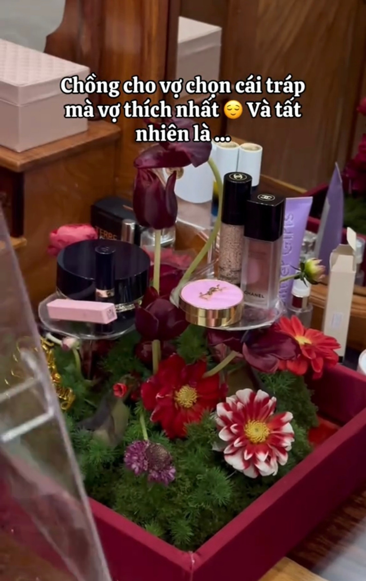 Tuy nhiên, cô dâu đã lên tiếng đính chính: tráp mỹ phẩm này không phải là lễ vật chính thức để dâng lên tổ tiên, mà chỉ là món quà riêng giữa vợ chồng. Gia đình vẫn có đầy đủ các tráp lễ truyền thống theo đúng phong tục. (Ảnh trong bài: @gaomakeup2806)