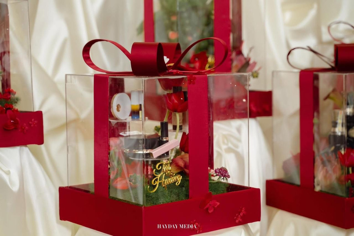 Tráp mỹ phẩm được đặt trong hộp trong suốt, buộc nơ ruy băng màu đỏ nổi bật, trang trí cùng hoa tươi, cây cỏ và một tấm bảng nhỏ khắc tên cô dâu, tạo nên một tổng thể vừa lung linh, lãng mạn, vừa thể hiện sự đầu tư lớn.