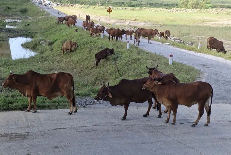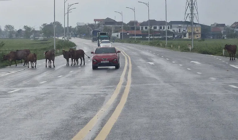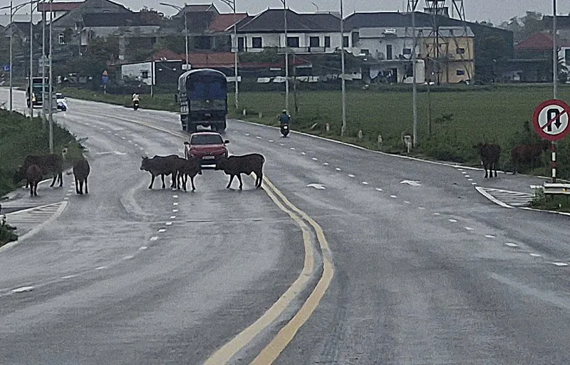 Mùa mưa lũ, đồng ruộng chưa thể gieo cấy, tần suất trâu bò thả rông xuất hiện tại nút giao Quốc lộ 8A với đường cao tốc nhiều hơn so với ngày thường.