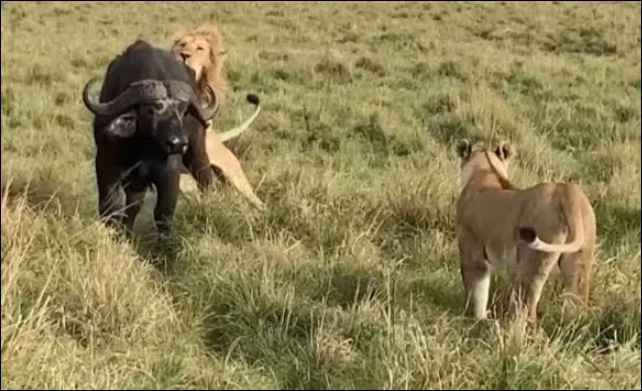 Ngay khi thấy trâu rừng bị thương ở chân sau, những con sư tử liền lao tới tấn công. Ban đầu, con trâu phản kháng rất mạnh mẽ khiến kẻ săn mồi không thể hạ gục nó.