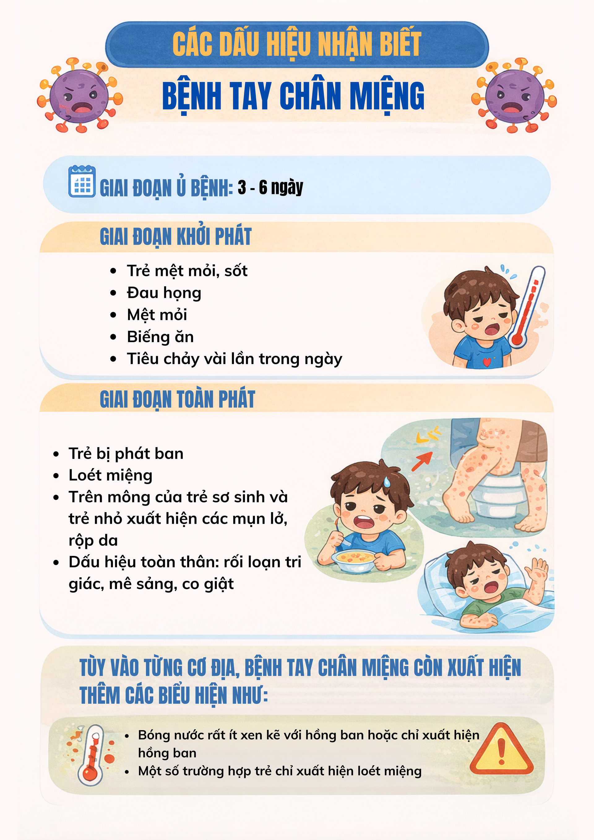 - Có hai sai lầm phổ biến. Thứ nhất, nhầm lẫn triệu chứng ban đầu. Tay chân miệng thường khởi phát với biểu hiện nhẹ như sốt, biếng ăn, quấy khóc hoặc nổi mụn nước ở tay, chân. Nhiều phụ huynh cho rằng trẻ mọc răng, bị nhiệt miệng hoặc sốt phát ban nên chủ quan, không đưa đi khám sớm.