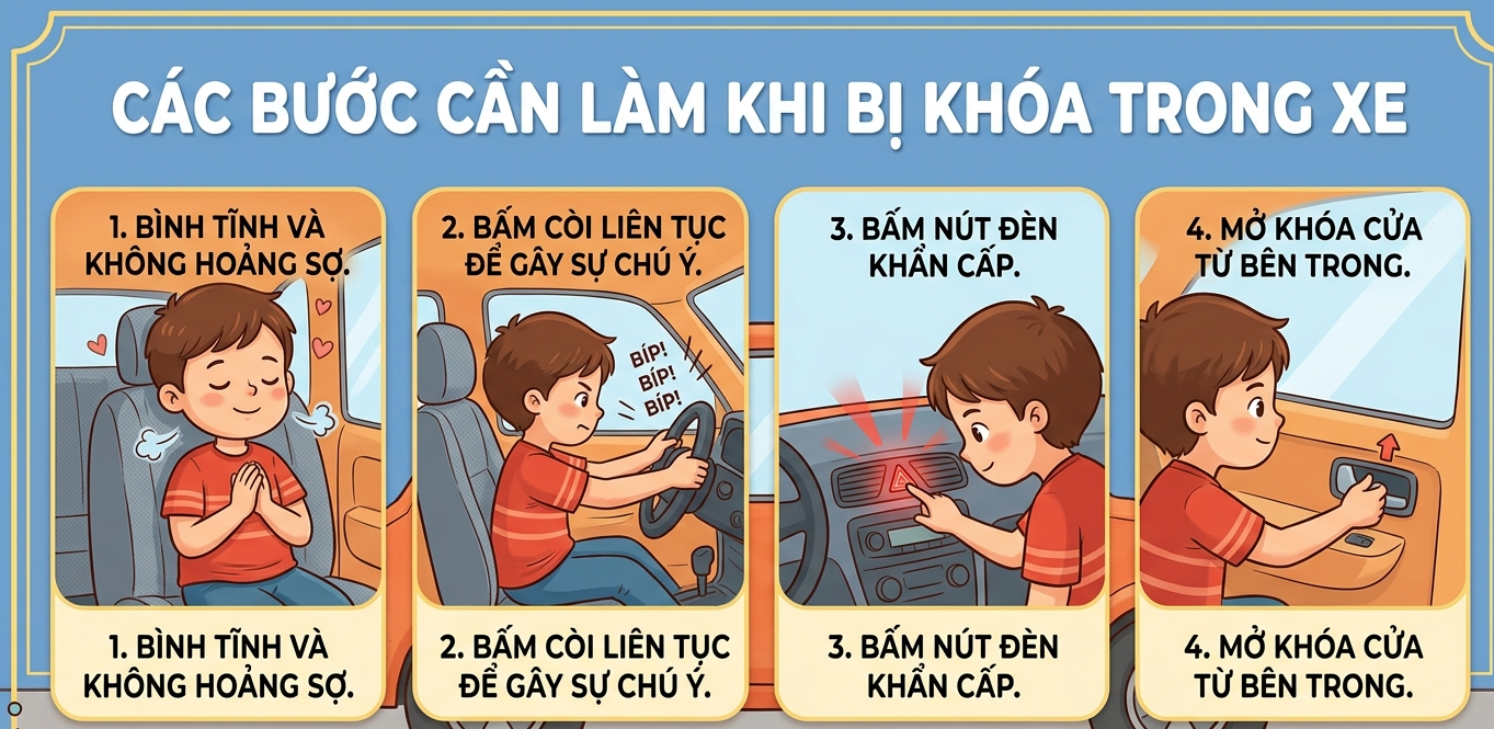 Bên cạnh đó, việc bật đèn cảnh báo khẩn cấp hoặc tìm cách mở cửa từ bên trong cũng có thể giúp thu hút sự chú ý của người xung quanh.