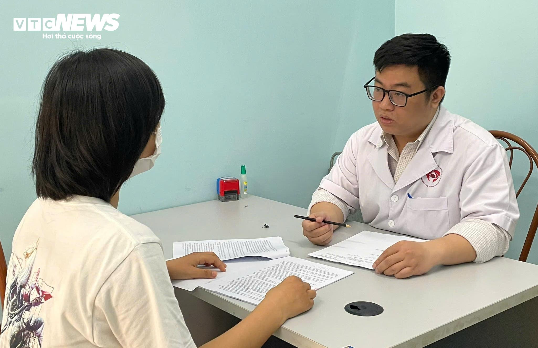 Bác sĩ Nguyễn Khắc Dũng thăm khám sức khỏe tâm lý cho bệnh nhân. (Ảnh: Như Loan)