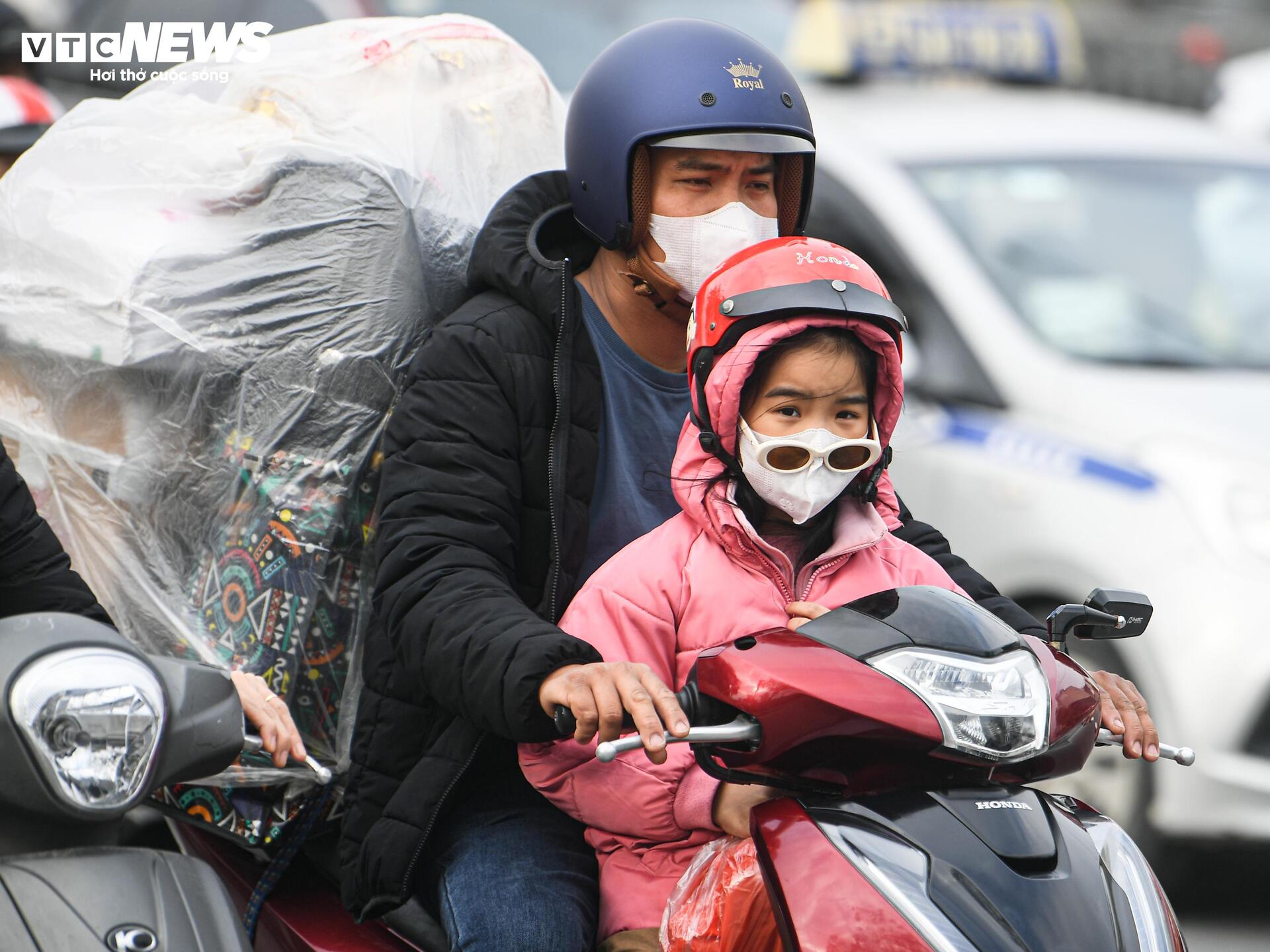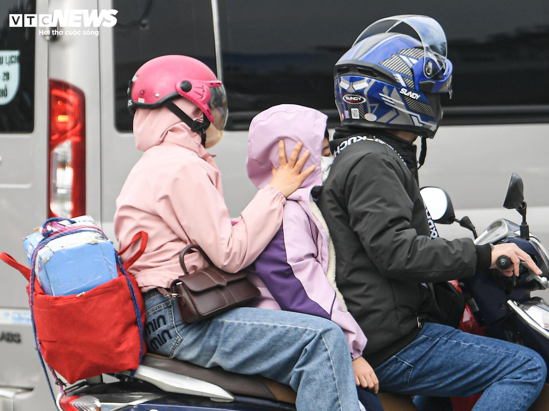 Trên một số xe máy, trẻ nhỏ mệt mỏi sau nhiều giờ di chuyển đã gục đầu vào lưng người lớn để nghỉ tạm.