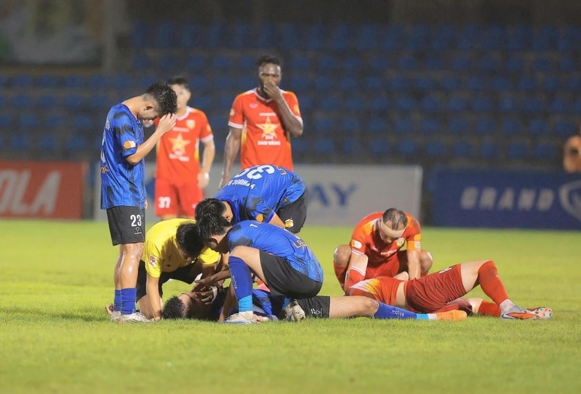 Trọng tài Nguyễn Mạnh Hải phản ứng cực nhanh, lao tới sơ cứu, hỗ trợ giữ an toàn cho cầu thủ, giảm thiểu rủi ro ngay tại chỗ trước khi lực lượng y tế can thiệp sâu hơn.