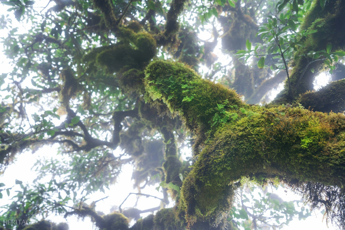 Trên đường đi, những rừng tre nứa, rừng gỗ lớn, rừng trúc lùn phủ kín lối đi cùng những vách đá cheo leo rêu phủ, vừa thách thức kỹ năng leo núi vừa mở ra những góc ảnh sống ảo tuyệt đẹp. Ảnh Vinh DAV