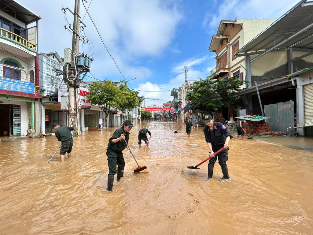 Theo đó, trong sáng nay, lực lượng Công an phối hợp với chính quyền và người dân địa phương thu dọn bùn đất, rác thải, làm sạch môi trường tại các tuyến đường, khu dân cư; đồng thời tổ chức cấp phát cơm, hỗ trợ nhu yếu phẩm cho các hộ dân bị cô lập, gặp khó khăn trong sinh hoạt.