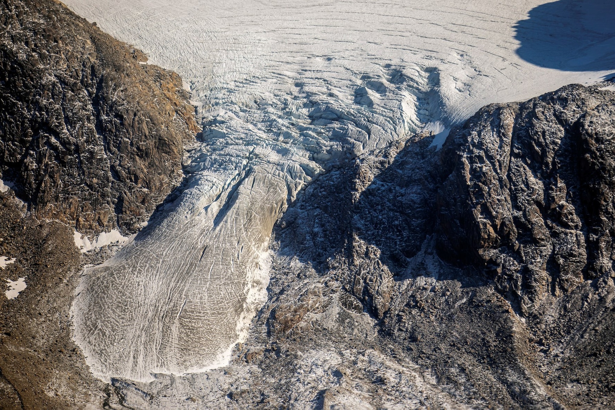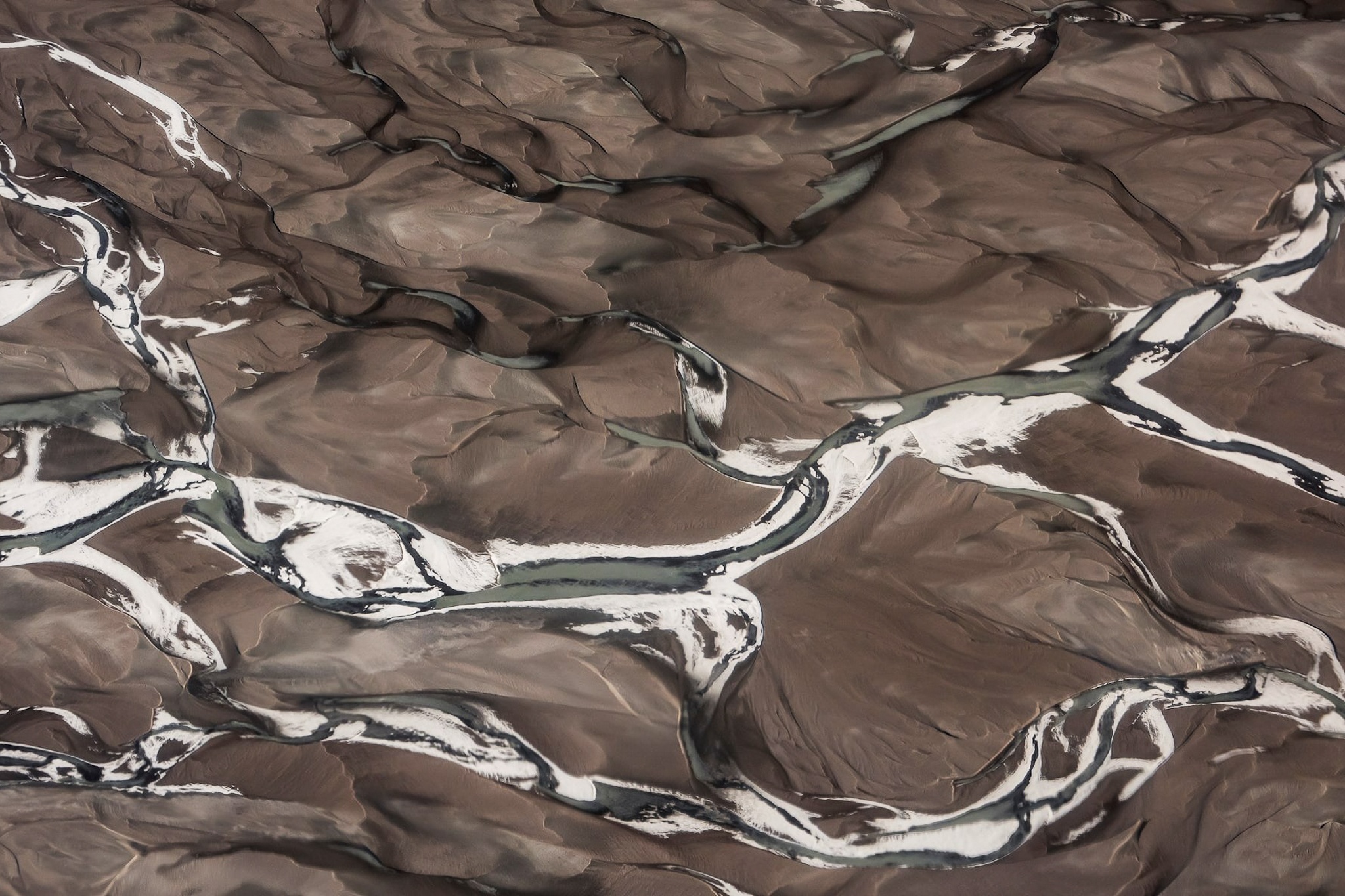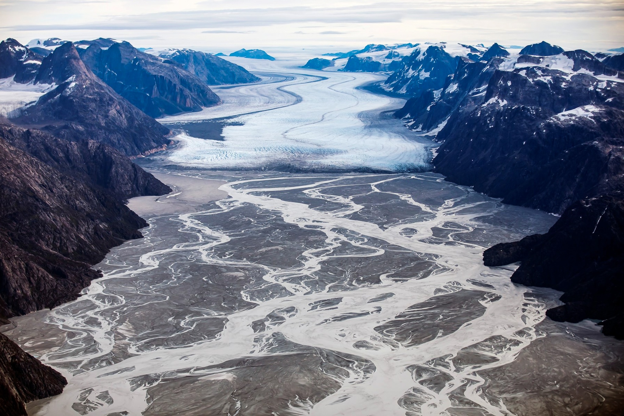 Nước tan từ sông băng hòa cùng bùn đá ở phía bắc Kangerlussuaq tạo nên bức tranh đẹp siêu thực, nơi những dòng sông băng trắng vẽ lên mặt đất Bắc Cực xám bạc.