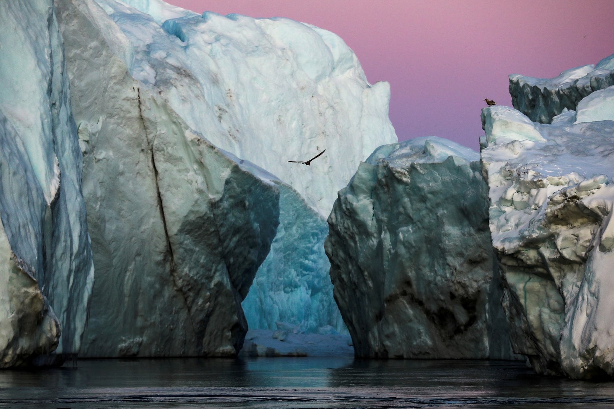 Điểm hút khách nhất là vịnh băng Icefjord - di sản UNESCO - nơi những tảng băng khổng lồ, cao ngang tòa nhà Manhattan, tách khỏi mũ băng Greenland rồi lững lờ trôi như "tàu ma" trên vịnh Disko. Trong ảnh, những tảng băng lững lờ trôi ở cửa vịnh hẹp băng Jakobshavn lúc hoàng hôn gần Ilulissat. Du khách có thể đi thuyền nhỏ len giữa "hạm đội băng trôi", nhưng phải giữ khoảng cách.