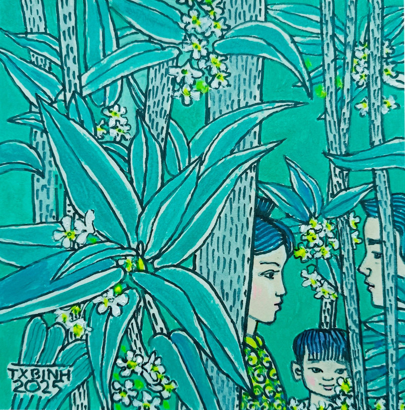 Bỗng cánh cửa nhà mở ra, vẫn tiếng kêu kèn kẹt như đay nghiến của mấy con mọt già thân thuộc. Nhân buông một tiếng gọi nhưng chợt giật mình, chưng hửng. Bước ra từ sau cánh cửa không phải em gái Nhân mà là một cô gái lạ. Bốn mắt nhìn nhau, cả hai đều bối rối, ngơ ngác. “Anh hỏi ai?” Cô dịu giọng. Nhìn dáng vẻ người đàn ông và chiếc va-li bên cạnh, cô đoán anh vừa đi xa về. Anh ta nhầm nhà hay đến thăm người từng ở căn nhà này, trước cô? Nhân ngỡ ngàng nhìn người con gái trước mặt, dáng vẻ thon gọn trong bộ quần áo ở nhà mầu hồng nhạt. Khuôn mặt có vài đốm tàn nhang, phảng phất u buồn và đôi mắt sâu loang loáng nước hồ thu. Mái tóc cột trên đỉnh đầu bung ra những lọn nhỏ, lòe xòe. Mồ hôi rịn ra bết trên những sợi tóc mai. Tiếng nói cô thoảng qua, nhẹ như gió, đến nỗi cô phải nhắc lại lần hai, anh mới nghe rõ. Tự nhiên, lưỡi anh líu lại. Những âm thanh giằng giữ nhau, không thoát được ra khỏi cuống họng. Nhân lúng túng lắc đầu rồi quay ra trong ánh mắt khó hiểu của cô gái. Bước chân anh giẫm lên thảm hoa mộc hương trước sân nhà. Mùi hương nhức nhối như muốn níu giữ anh ở lại...