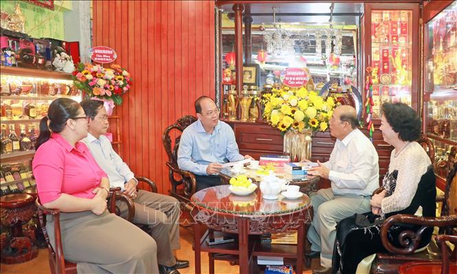 Bí thư Tỉnh ủy Cà Mau Nguyễn Hồ Hải (giữa) cùng đoàn công tác đến thăm, chúc mừng Nhà giáo Nhân dân - Tiến sĩ Thái Văn Long (thứ hai, bên phải). Ảnh: Huỳnh Anh - TTXVN