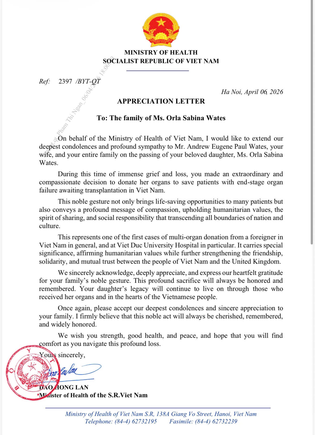 Bộ trưởng Bộ Y tế Đào Hồng Lan gửi thư nhấn mạnh sự trân trọng và biết ơn đối với nghĩa cử cao đẹp của gia đình; đồng thời khẳng định sự hy sinh này sẽ luôn được ghi nhớ và di sản của O.S.W sẽ tiếp tục sống mãi trong những cuộc đời được hồi sinh cũng như trong trái tim người dân Việt Nam. Ảnh: BVCC