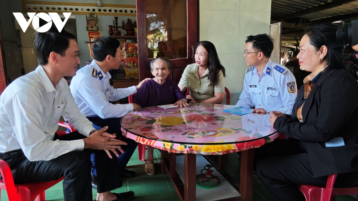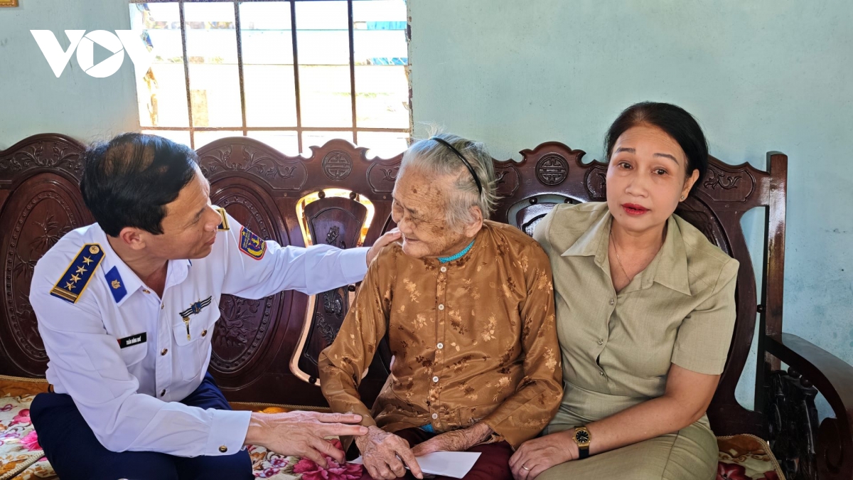Đại tá Trần Hồng Quế, Phó Chính ủy Vùng Cảnh sát biển 2 và bà Võ Thị Tuyết Nhung, Phó trưởng Ban Tuyên giáo và Dân vận Tỉnh ủy Quảng Ngãi thăm, tặng quà Mẹ Việt Nam anh hùng Nguyễn Thị Trợ, ở thôn Mỹ Danh, xã Ba Gia.