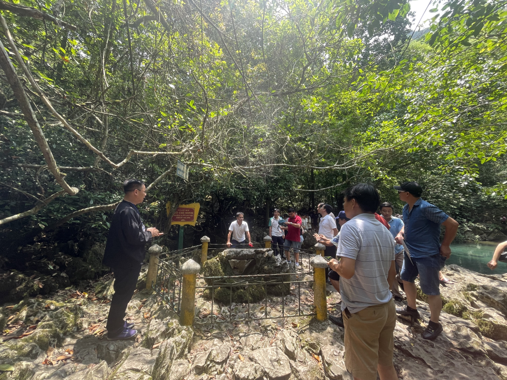 Khách du lịch tham quan Bàn đá - nơi Bác Hồ ngồi làm việc và đưa ra những quyết sách quan trọng trong thời gian Người sống và làm việc ở Pác Bó, xã Trường Hà giai đoạn 1941 - 1945.