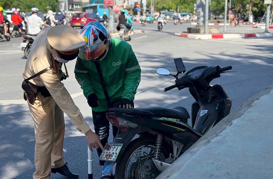 Cảnh sát giao thông (Công an thành phố Hà Nội) chỉ ra lỗi che biển số của người điều khiển phương tiện tham gia giao thông.