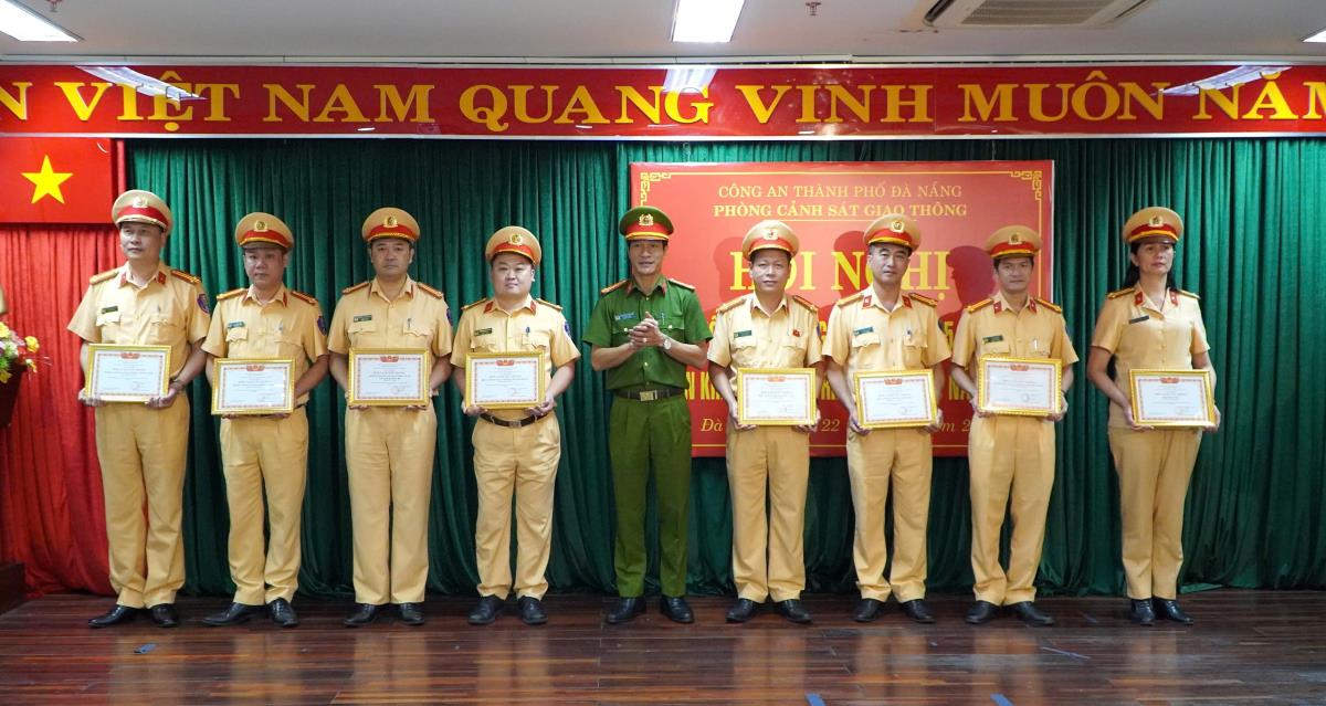 Thượng tá Trần Minh Nguyên khen thưởng các tập thể có thành tích xuất sắc.
