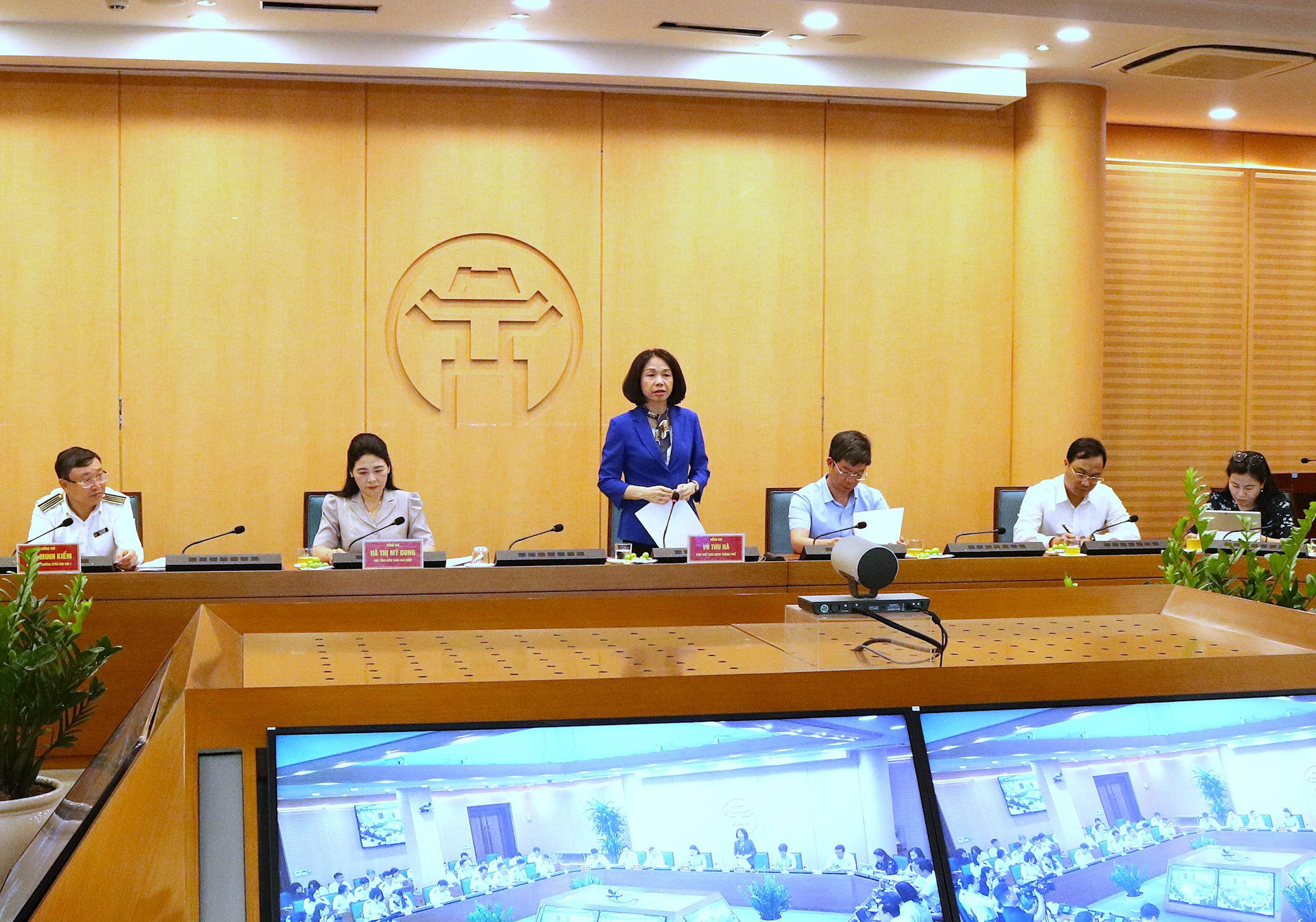 Phó Tổng Kiểm toán nhà nước Hà Thị Mỹ Dung và Phó Chủ tịch UBND TP. Hà Nội Vũ Thu Hà chủ trì Hội nghị.