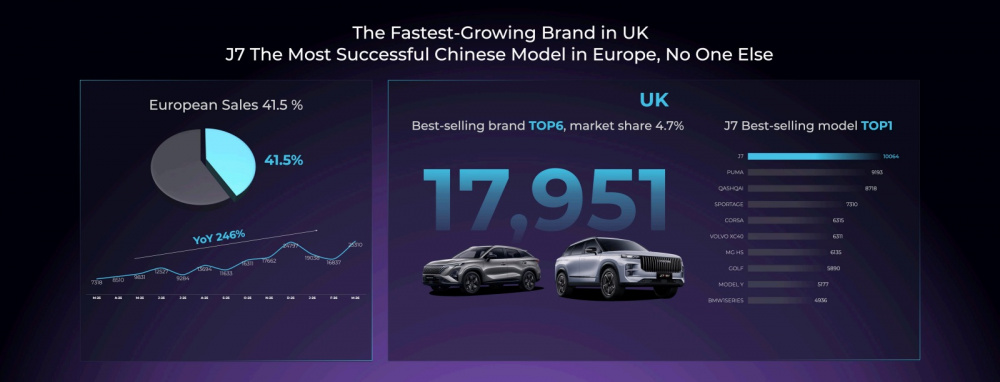 Tại Anh, OMODA & JAECOO vươn lên vị trí thứ 6 toàn thị trường với thị phần 4,7%, đạt gần 18.000 xe/tháng. Mẫu JAECOO 7 dẫn đầu bảng xếp hạng doanh số theo mẫu xe và được truyền thông quốc tế đánh giá là “mẫu xe Trung Quốc thành công nhất tại châu Âu”.