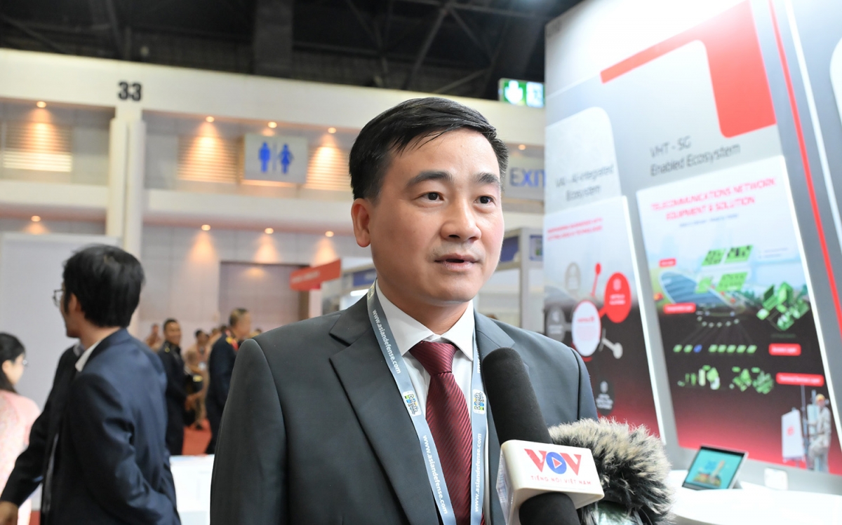 Phó tổng giám đốc TCT Sản xuất thiết bị Viettel (VMC) Tăng Trường Sơn trả lời phỏng vấn của phóng viên VOV tại sự kiện