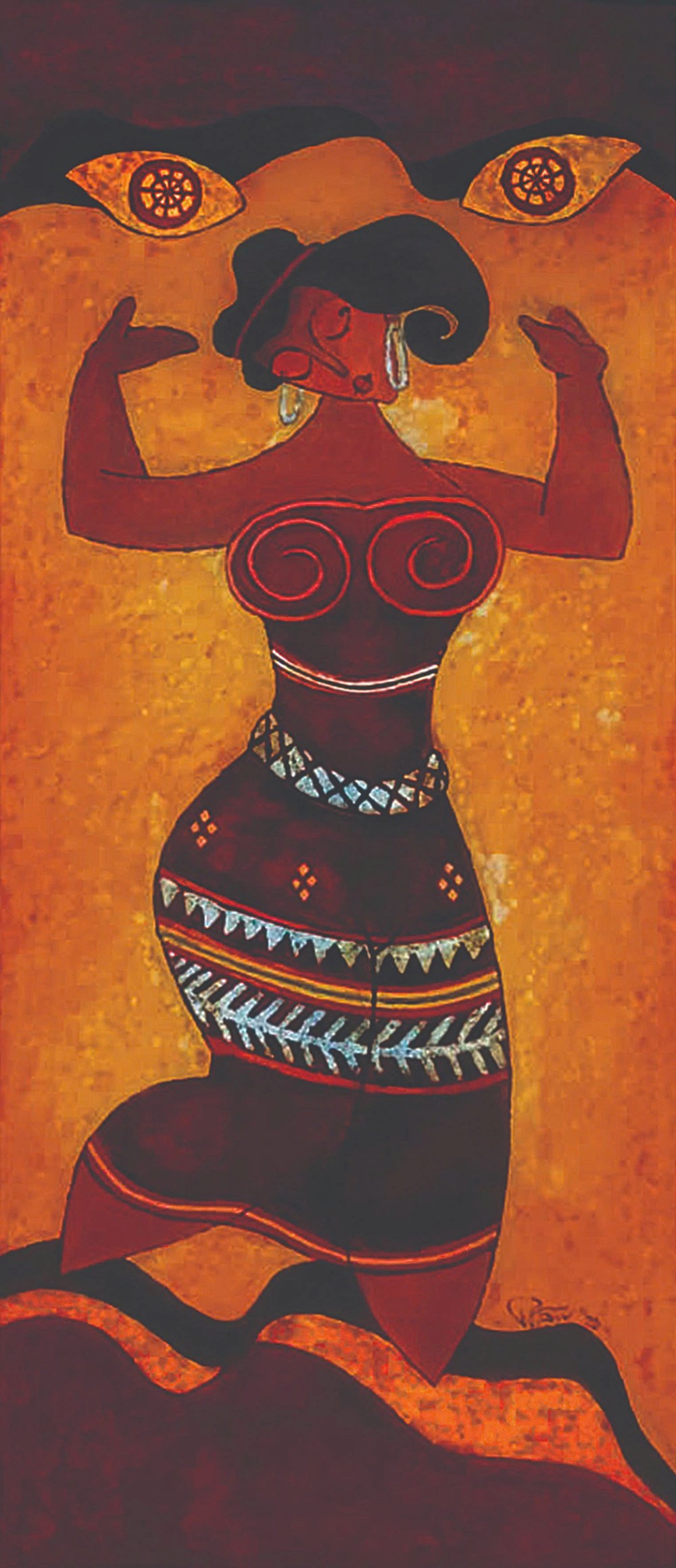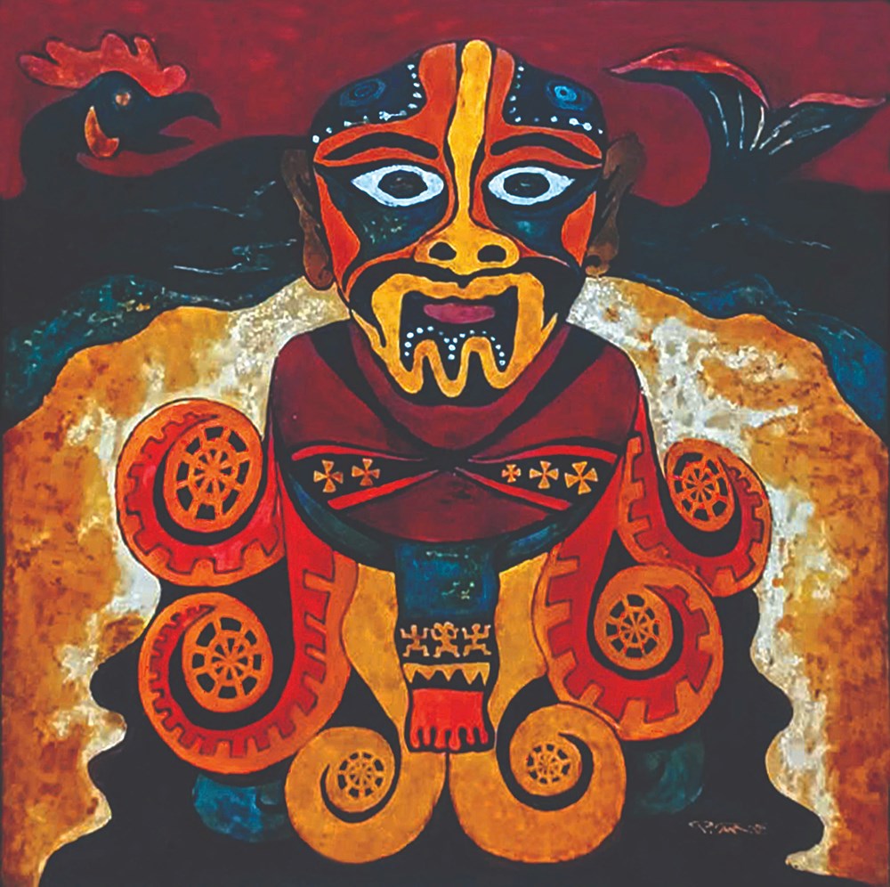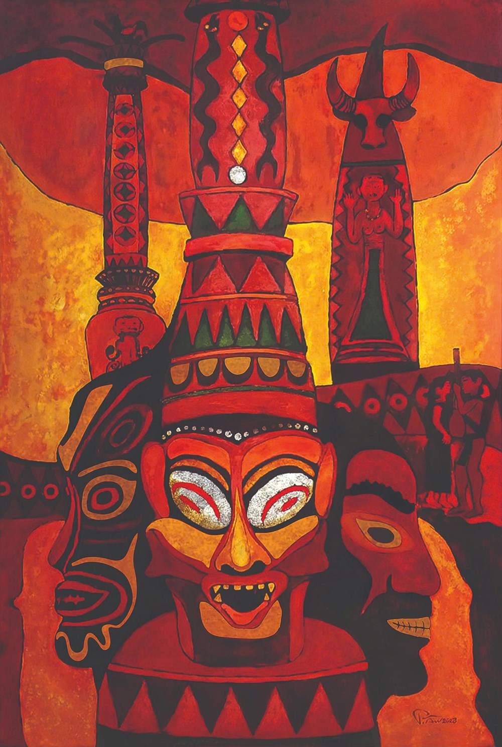 Họa sĩ không vẽ người Cơ Tu theo nghĩa mô tả đời sống, mà tiếp cận các yếu tố văn hóa như những thực thể tạo hình. Các chi tiết như hốc mắt sâu, miệng mở rộng hay đường khắc xoắn ốc được chuyển hóa thành nhịp điệu thị giác và lực đẩy bố cục, giữ lại cảm giác nguyên sơ nhưng được tổ chức trong một cấu trúc rõ ràng.