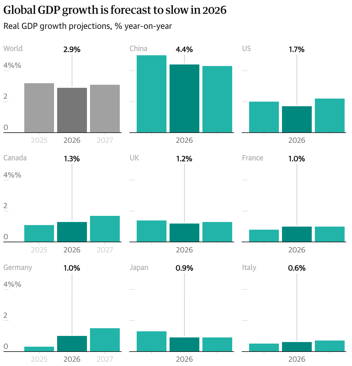 Dự báo tăng trưởng GDP toàn cầu sẽ chậm lại vào năm 2026. Biểu đồ: The Guardian. Nguồn: OECD