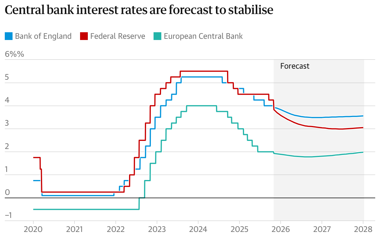 Dự báo lãi suất của các ngân hàng trung ương sẽ ổn định. Biểu đồ: The Guardian. Nguồn: Ngân hàng Anh.