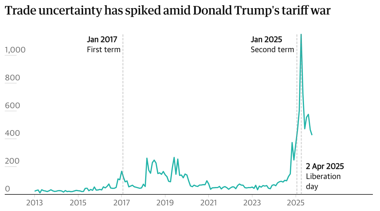 Tình trạng bất ổn thương mại tăng mạnh trong bối cảnh cuộc chiến thuế quan của Tổng thống Mỹ Donald Trump. Biểu đồ: The Guardian. Nguồn: OECD