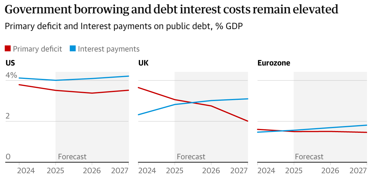 Chi phí vay nợ và lãi suất nợ của các chính phủ vẫn ở mức cao. Biểu đồ: The Guardian. Nguồn: OECD