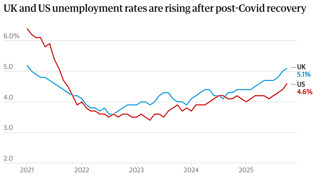 Tỷ lệ thất nghiệp ở Anh và Mỹ đang tăng lên sau giai đoạn phục hồi hậu Covid. Biểu đồ: The Guardian. Nguồn: Refinitiv